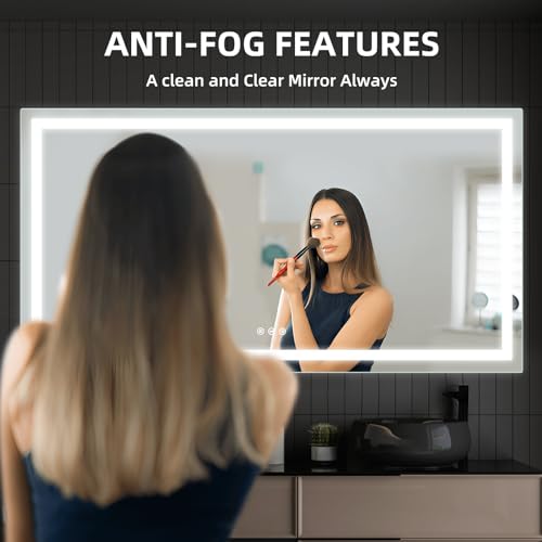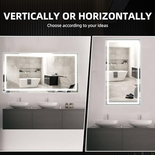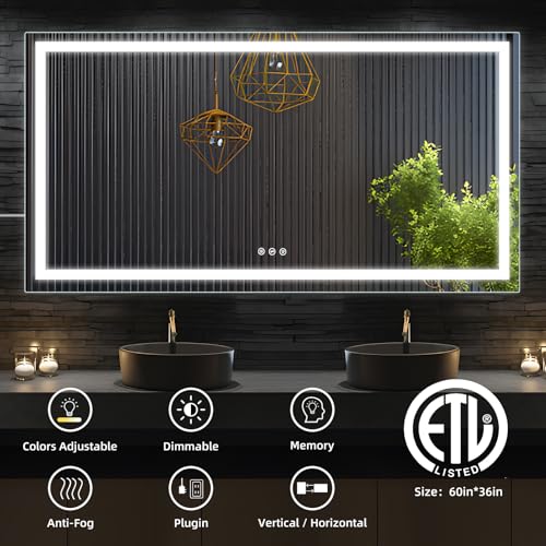 Garvee LED Bathroom Mirror 60x36 inch, Stepless Dimmable, Anti-Fog, Shatter-Proof, Memory, 3 Colors, Double LED, Wall Mounted, Suitable for Makeup and Shaving