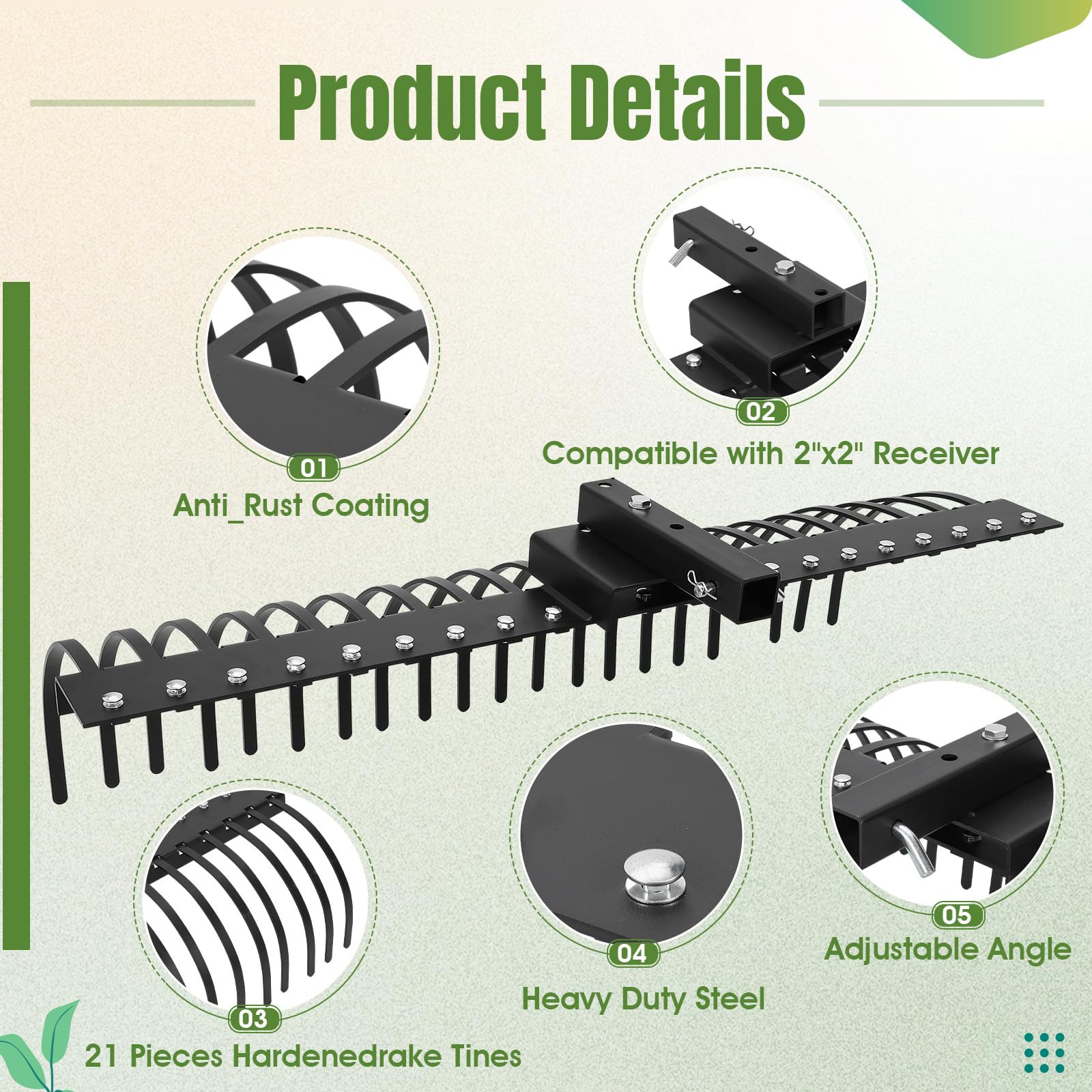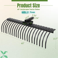 Garvee 60 Inch Landscape Rock Rake,3 Point Attach Rake Fit for 2 Inch Receiver with 360 Degree Rotation,Tow-Behind Garden Tool for Compact Tractors, Category 1