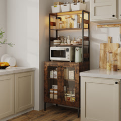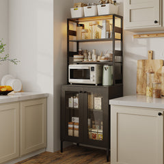 Garvee 67" Tall Kitchen Pantry Bar Cabinet with Tempered Glass Doors, LED Lights and Power Outlets, Black