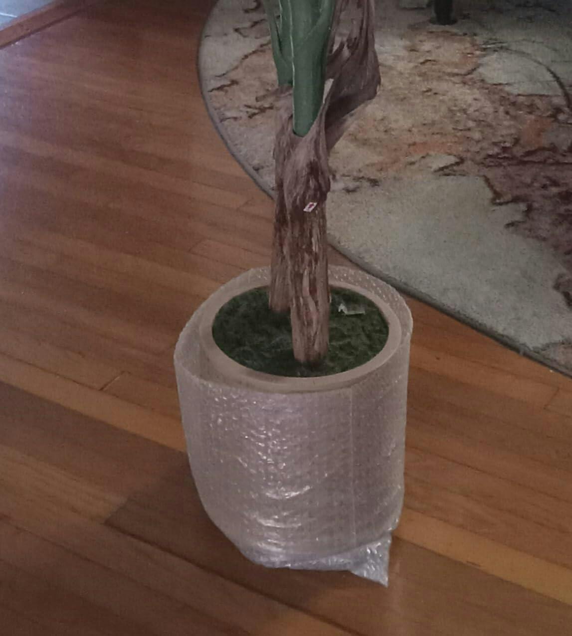 This tree actually looks pretty good in person, and unless you were really up close inspecting it, you wouldn’t know it’s fake. Any wrinkles in the leaves are easily smoothed out using a hairdryer after you first unpack it, and setting it up is very simple and straightforward. The only thing I’d suggest is getting a really nice pot to put it in, as the one it comes with isn’t really the greatest, and having a great pot was the perfect finishing touch for ours.
