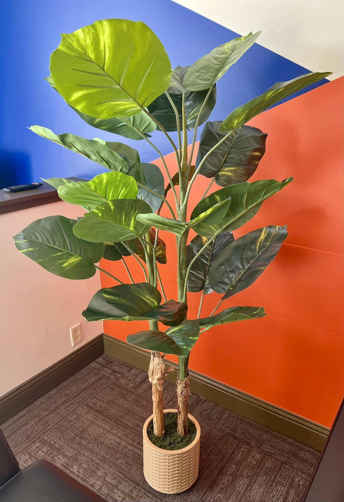 This faux golden pothos tree looks nice in a corner or next to furniture. The leaves are detailed enough for indoor décor, and the planter gives it a finished look. It’s not super full, but once arranged, it gives a natural shape. Lightweight and easy to move around.