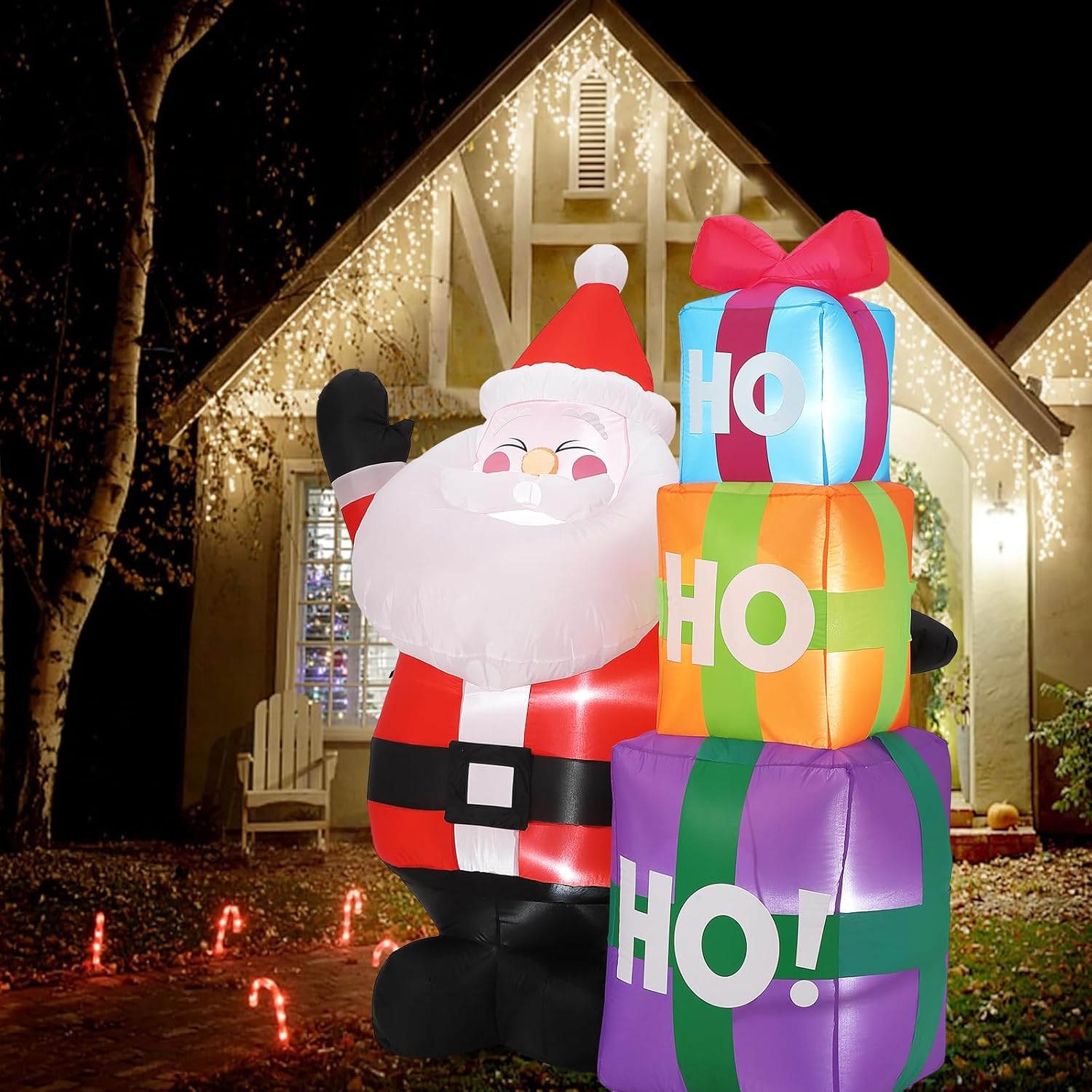 - Built-In Warm White LED Lights: Brighten up your holiday season with the built-in warm white LED lights that illuminate this inflatable decoration at night. This feature enhances its visibility while adding a cozy, festive glow to your outdoor decor, making it an eye-catching addition to any Christmas display.