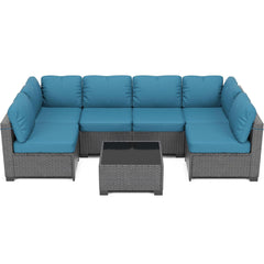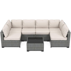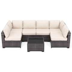 Garvee 7-Piece PE Rattan Outdoor Patio Set Modular Sectional Sofa Thick Cushions Glass Top Coffee Table Garden Balcony Porch