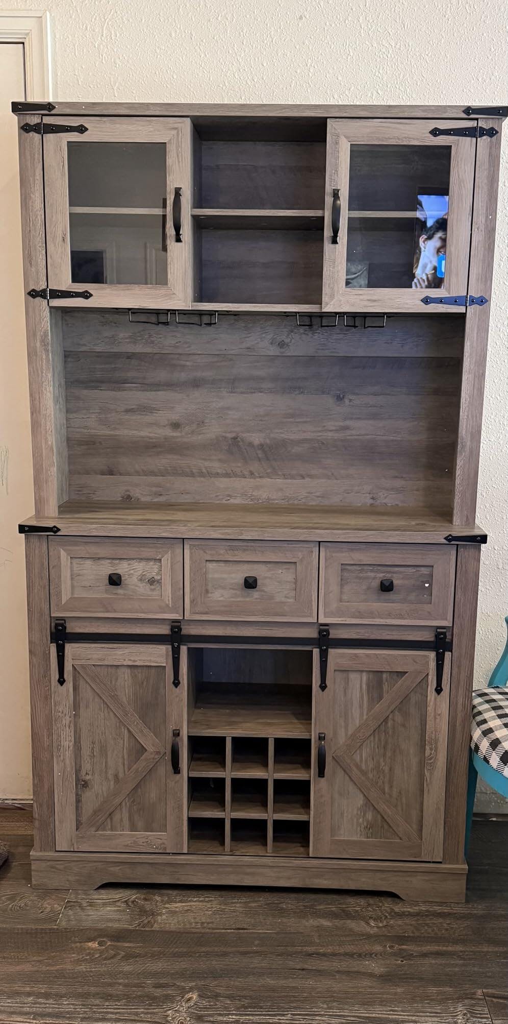 - Ample Storage Space: This versatile kitchen hutch cabinet is designed to meet all your storage needs. The upper hutch features 2 open shelves and 4 shelves with glass doors to provide large storage space while helping you find items easily, while 3 drawers provide tidy organization for tableware. The spacious countertop is perfect to store microwave, coffee maker. With the capacity to accommodate 12 wine bottles and 3 rows of glass slots, this cabinet is perfect for your liquor collection