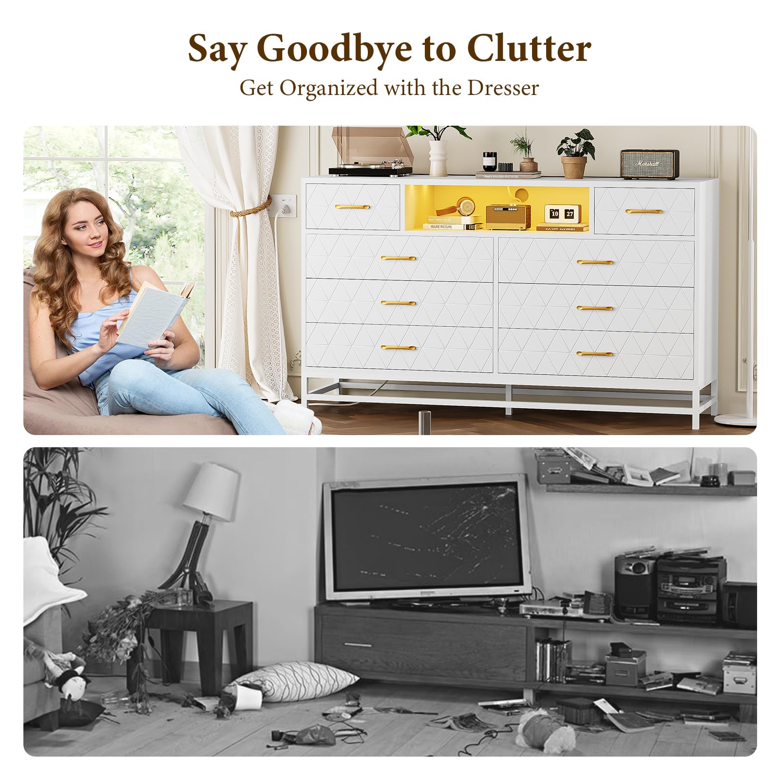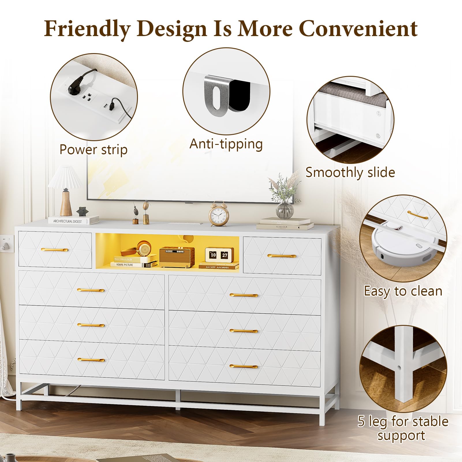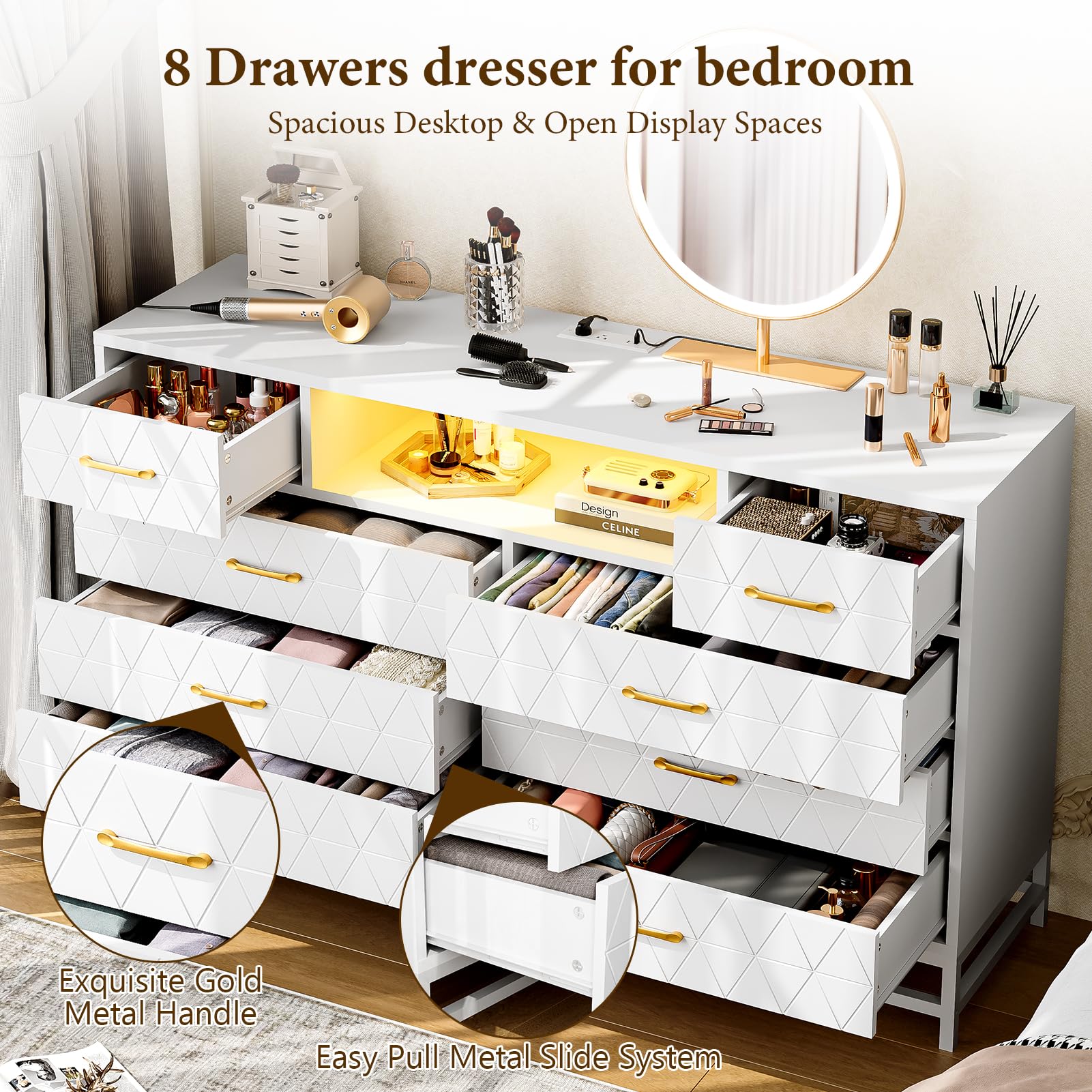 Garvee 8 Drawer Dresser for Bedroom, White Dresser with Led Light, 55 Inch Tv Stand Dressers with Power Outlet, Large Dresser Bedroom with Deep Drawers, Handles, Modern Dresser Storage