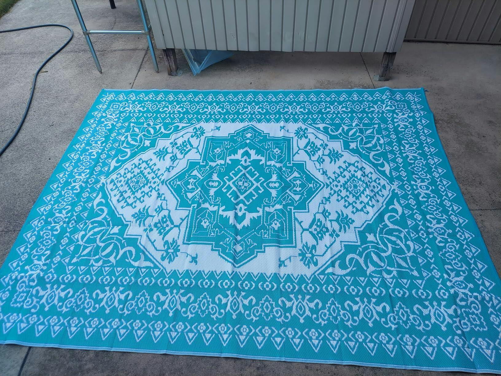 This is a good sized outdoor rug. I got it to put down at the entrance of my camper when camping. It's very light and comes with stakes that you will need to hold it in place, each corner has a stake loop sewn in for this purpose. This is an important feature and then something to consider when determining what you are going to use this rug for. If you put it on the deck or on a patio where you will not be able to stake it down, this rug is not going to stay in place with the slightest bit of wind. You would absolutely need to hold it down with patio furniture or something heavy. I had it out on my back patio with a patio paver block on each corner and a mild wind was still lifting it and moving it around. So if you think you're going to lay this down on an outdoor patio and it's going to stay in place on its own, it's not. So the mat itself, it comes all folded up. You lay it out and the creases from all the folds are permanent. That is good and bad. It's good because I am going to use it for camping and I need to fold it up for storage and transportation. With all the creases in place it folds nicely and then will actually fit into the included carry case. When I first unpacked the rug and I saw the included zippered carry case, my first impression was that, "This thing is NOT going to fit in this bag". But it did, see photo. Then the negative side of the creases is that again, they are permanent. When the rug is laid out it never actually lays completely flat and you can always see the creases. If I weren't needing to fold it up for camping and I just wanted it for a patio rug, I would not like all the permanent fold creases in it. It would be nice if they could provide and ship this rug on a roll instead of folding it for those that do not want it folded up. The product description says the crease is temporary and to give it time. I laid this out on my patio in 90 plus degree weather all day, held down with patio pavers and the creases never did go away completely. Perhaps after several days it would get better. Just something to be aware of so you know what to expect. The rug came out with a strong smell but quickly dissipated and being outdoors did not become an issue for me. I love the huge footprint, the storage bag and stakes, the material is comfortable to walk on with the weave of the rug and composition making it durable as well. The design and colors are great. It seems that with a little care it should be durable enough to last a while. The small one is pretty good size and they come even bigger if that is your need. At the price point, I felt it was well worth the cost.