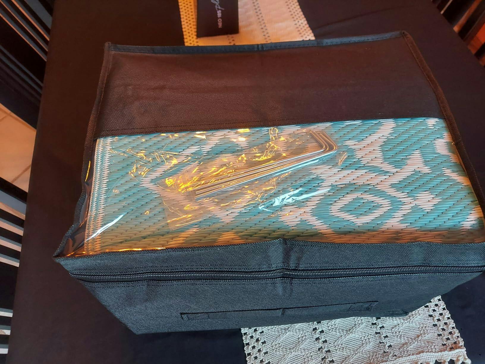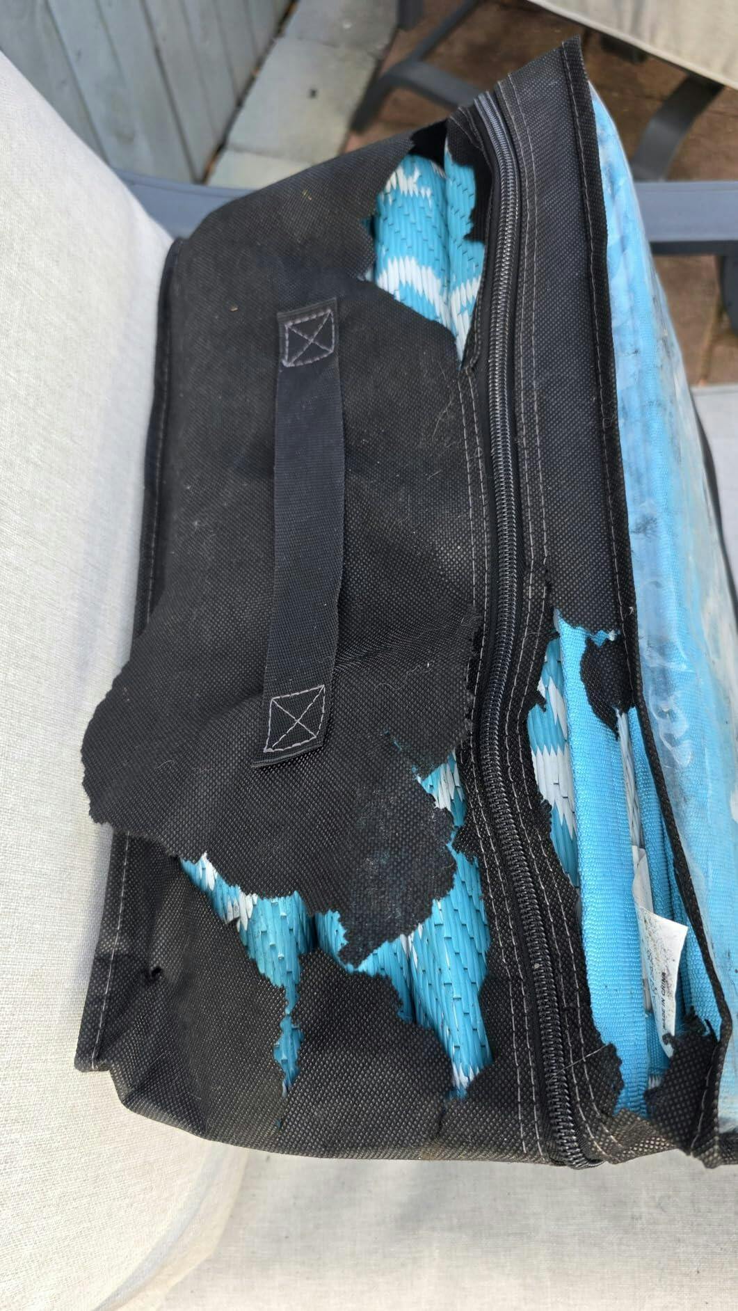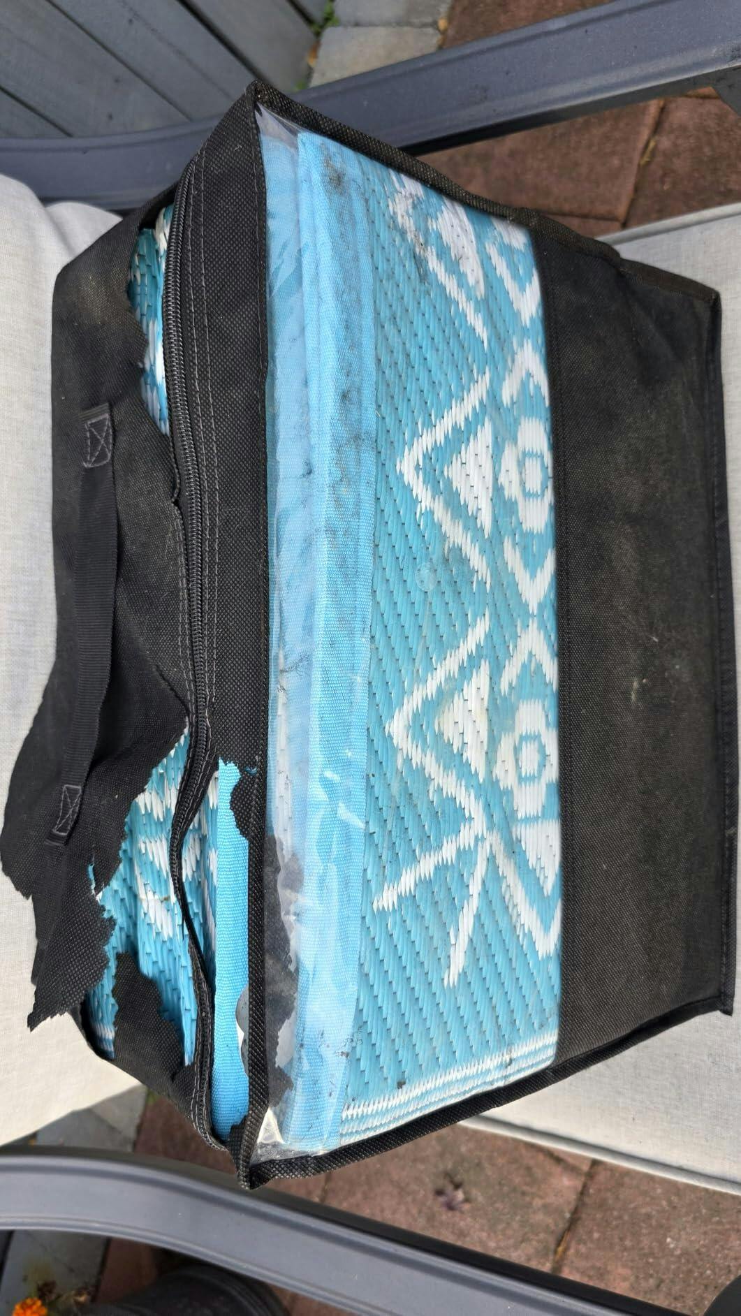 Nice rug for use with our small camper. Being relatively stiff, it folds up neatly into a block that fits easily into the included bag. It's has a woven finish and appears to be easy to clean and will not attract or hold dirt and debris. It comes with pins, that will probably work OK, but considering the stiffness of the mat, should be a little heavier. The bag is very lightweight canvas material, again OK, but doesn't not look very durable in the long term. Overall, I like this mat rug.