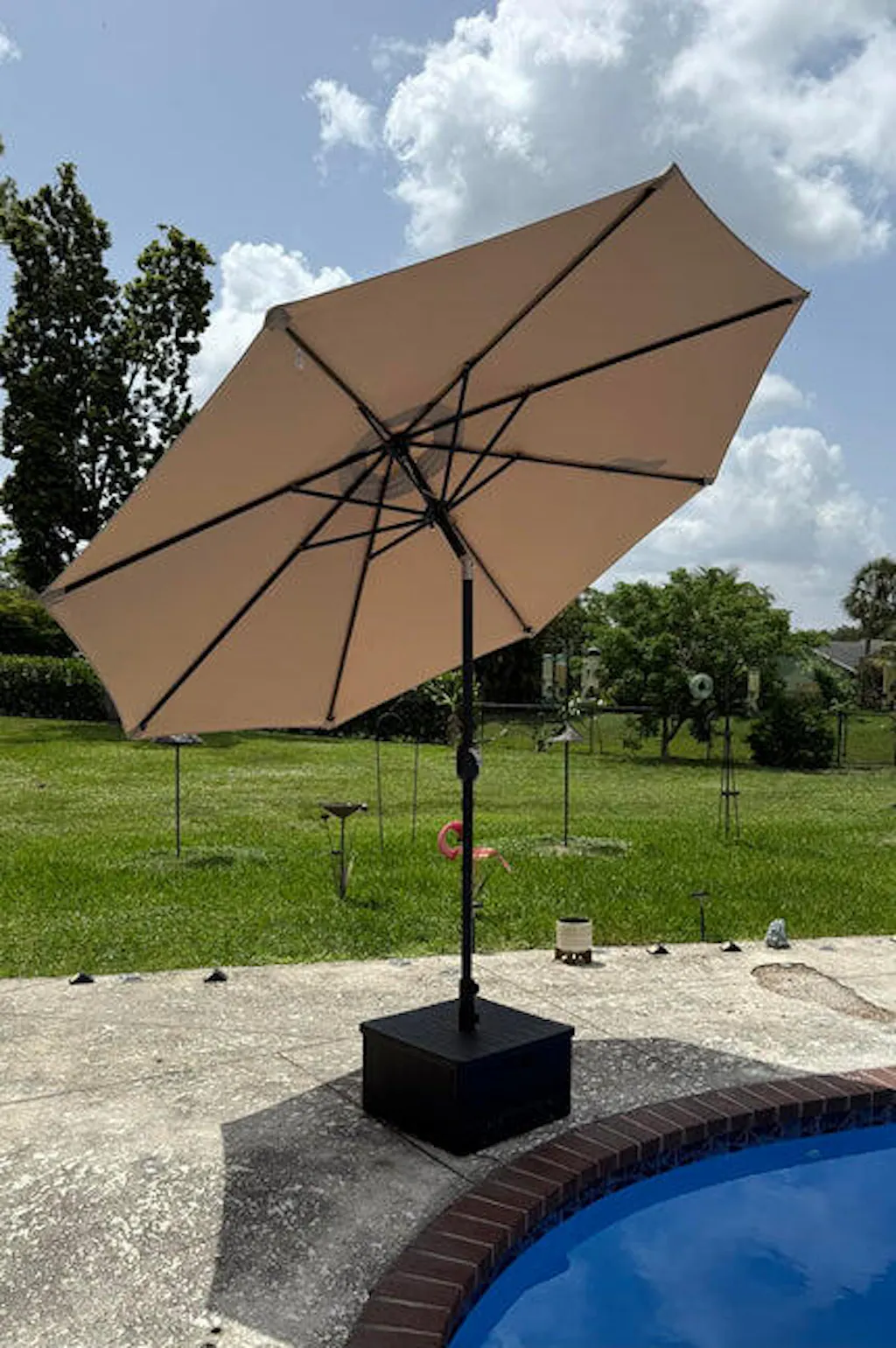 LOVE this umbrella so far. When it’s opened, I noticed that the design allows for a little movement, which is a smart addition for areas that tend to experience varying winds. It fits a standard base and the umbrella itself is pretty lightweight. Definitely recommend for anyone needing a little shade.