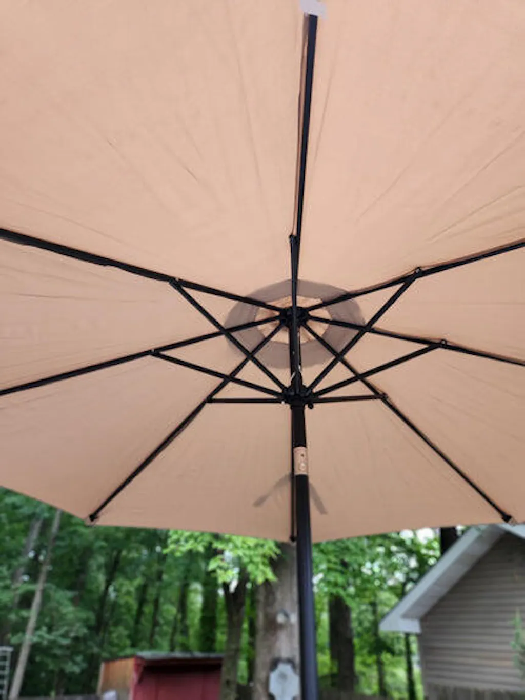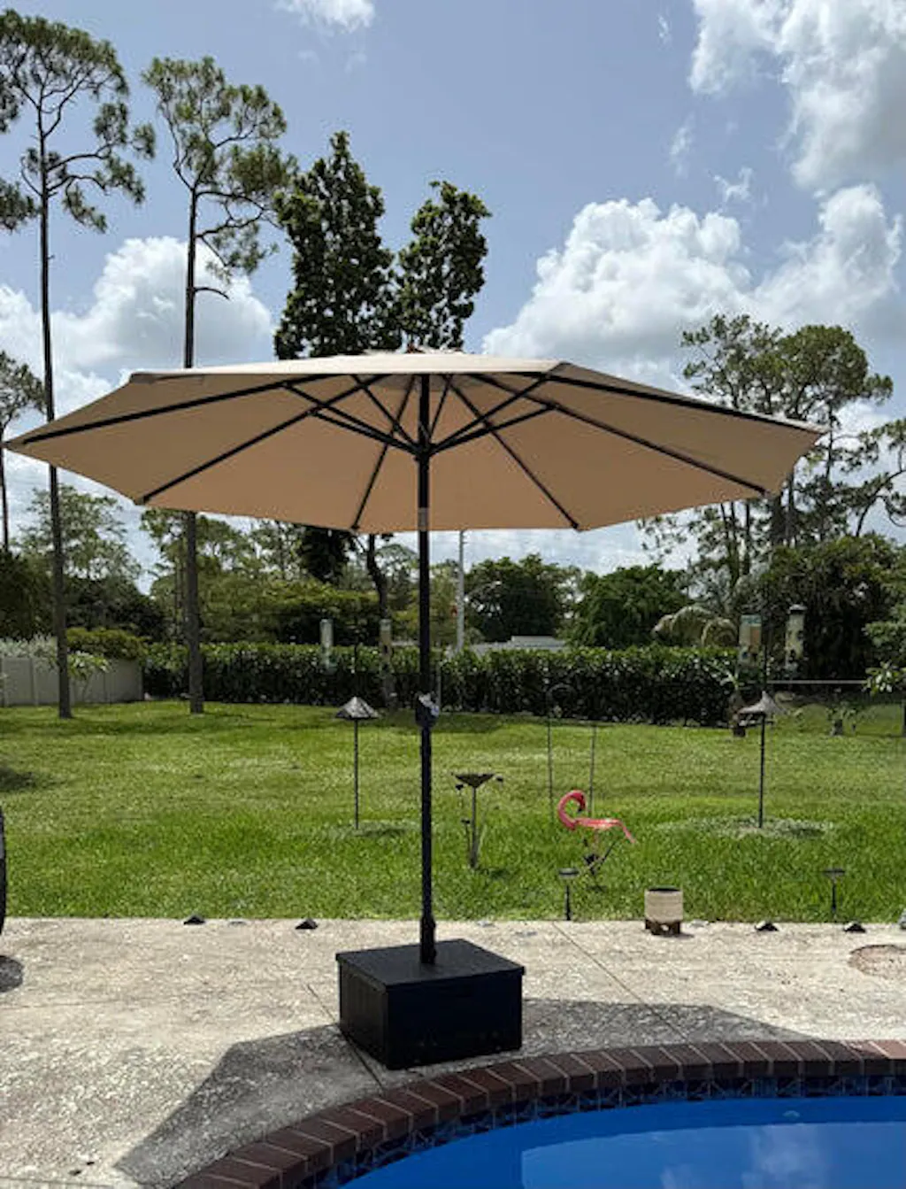 I'm very happy with this umbrella. I was wondering if I would be underwhelmed by the boring beige color of it. However, I think it looks classy and serene next to my pool. It gives us some much needed shade here in Florida. The crank to raise the umbrella feels like good quality and works well. I see that the string that the crank pulls up at the top is pretty thin so I do wonder how it will old up, but so far so good. It has a button near the umbrella itself so that you can angle the umbrella as the sun moves. It fit well into my umbrella stand. I'm happy to have this needed shade for my yard!