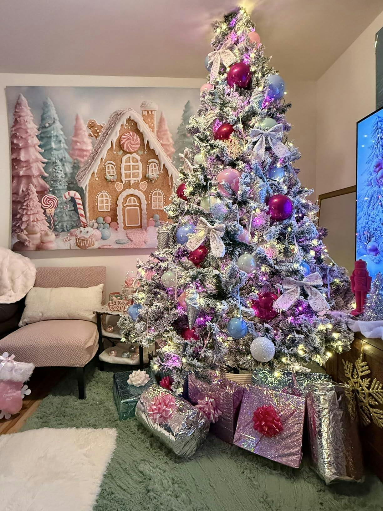 Garvee 9ft Pre-Lit Flocked Christmas Tree, Artificial Christmas Tree with 900 LED Lights & 8 Lighting Modes, Xmas Tree with Metal Hinges and Foldable Base for Home & Office Decor