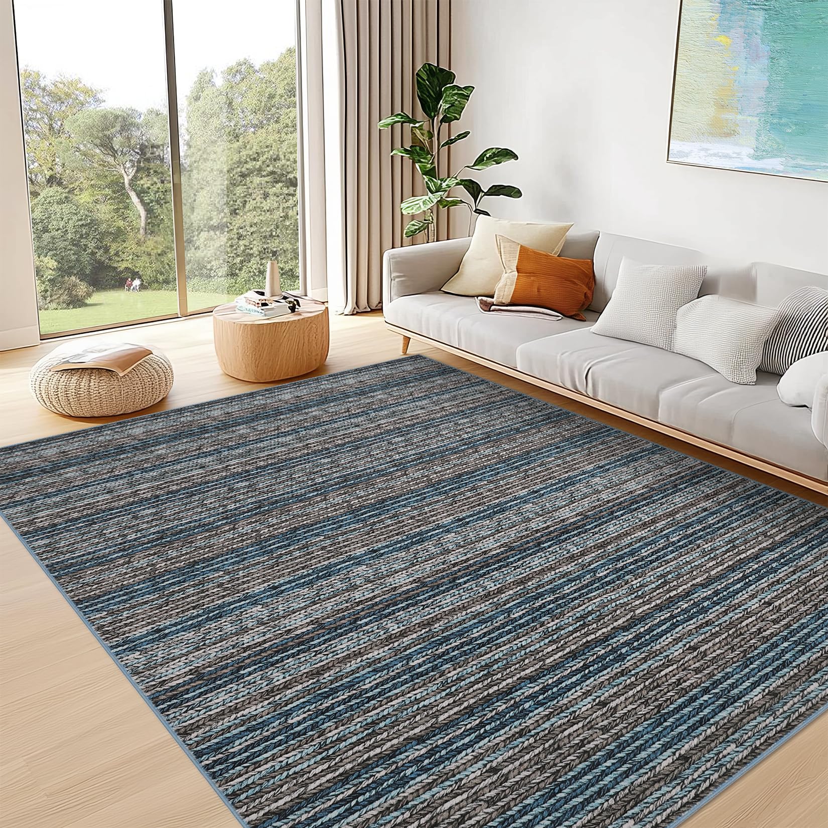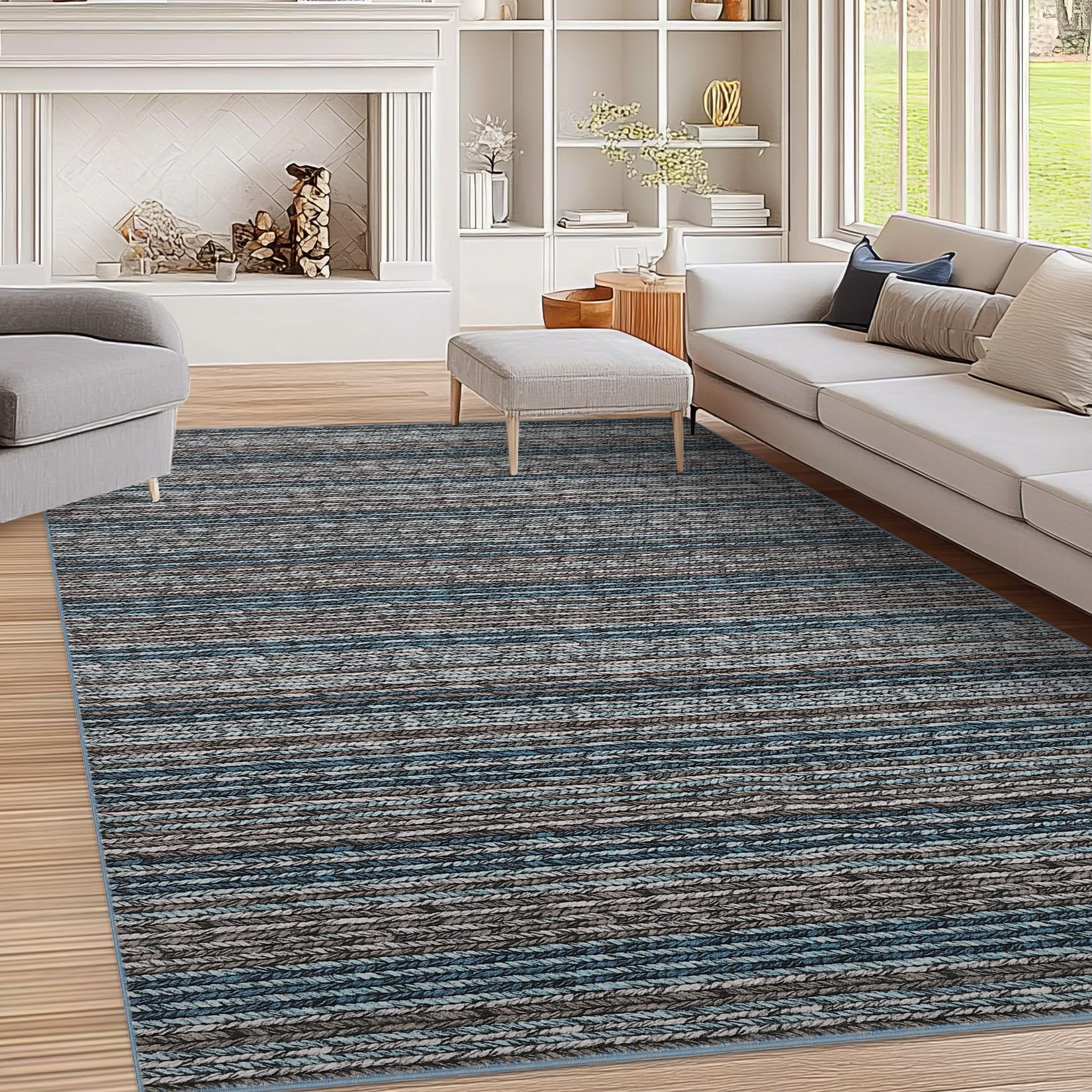 Garvee 9x12 Area Rug Modern Striped Rugs for Living Room Printed Braid Rugs Large Area Rugs Non-Slip Soft Gradient Rug for Bedroom Print Thin Abstract Carpet for Home Office, Blue