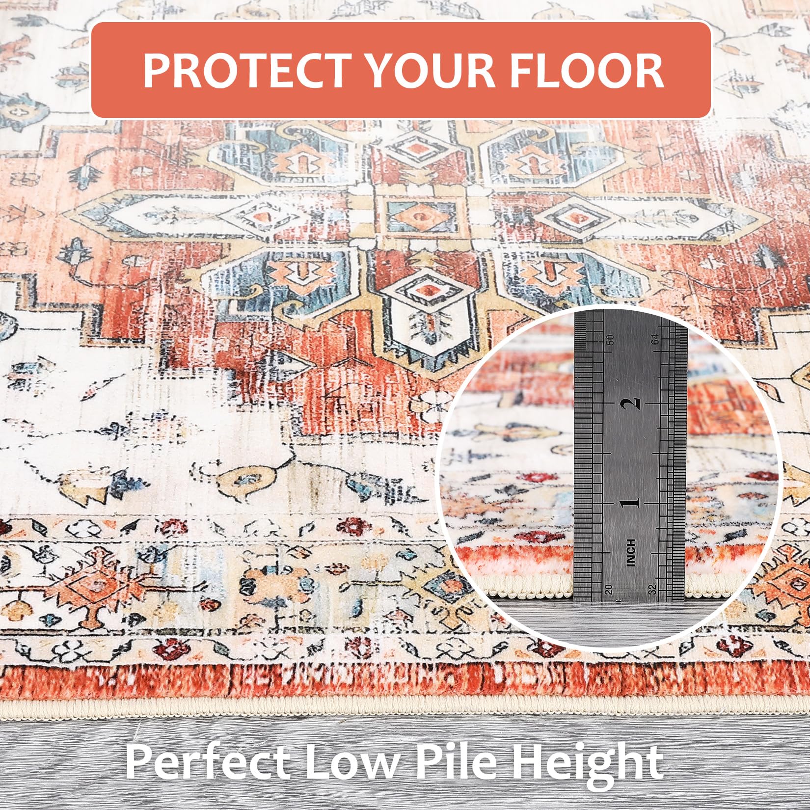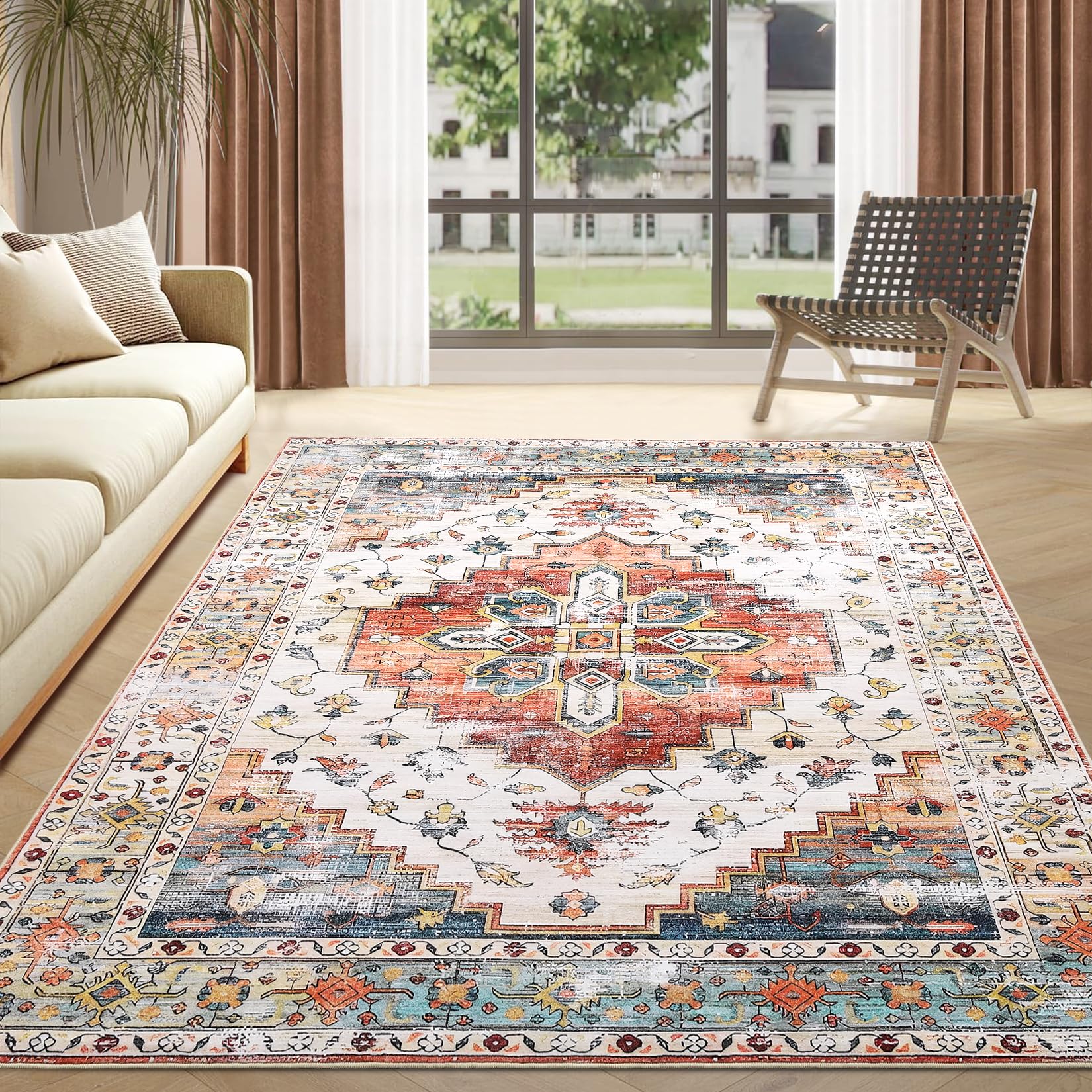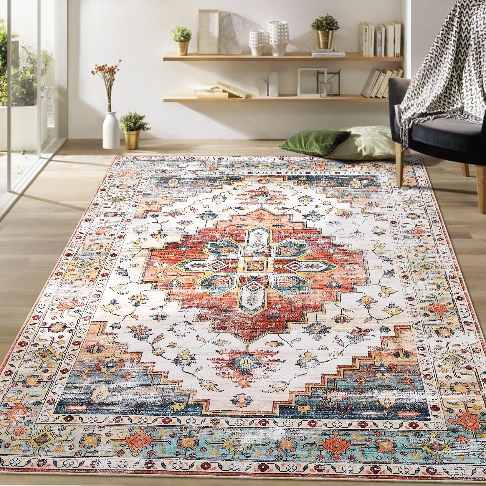 Garvee 9x12 Washable Boho Area Rug - Soft Polyester, Distressed Vintage Design, Non-Slip, Low Pile, Ideal for Living Room & Bedroom