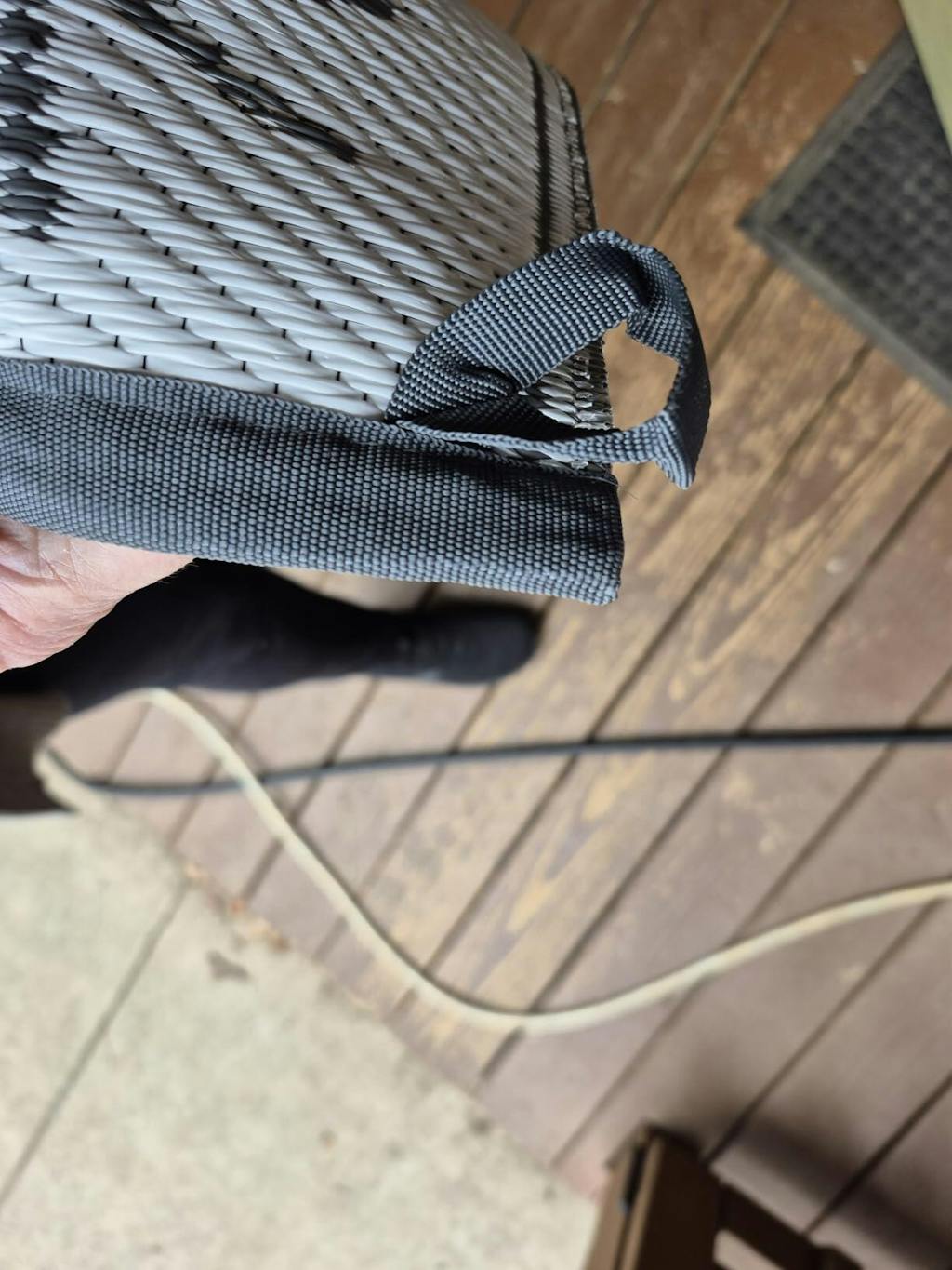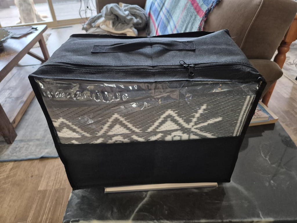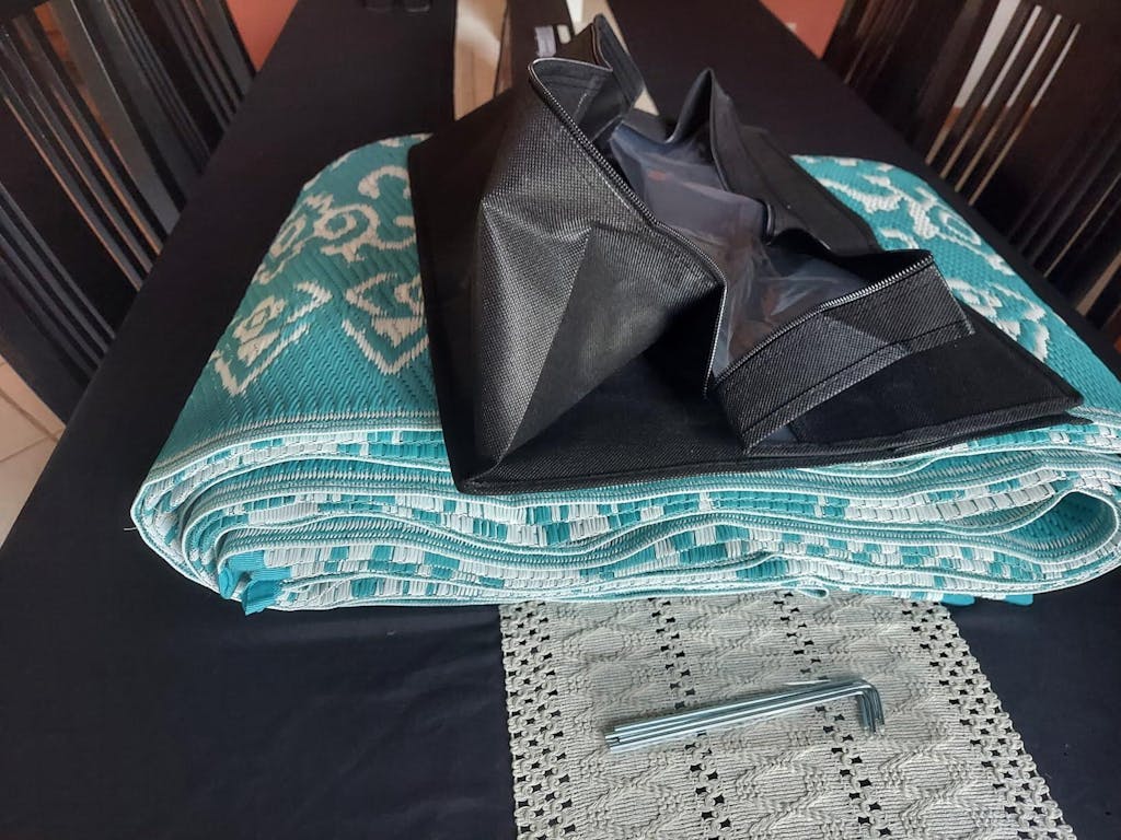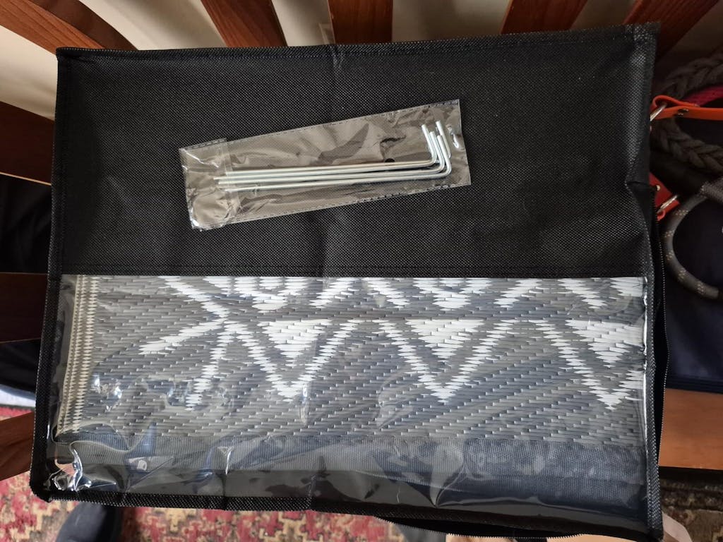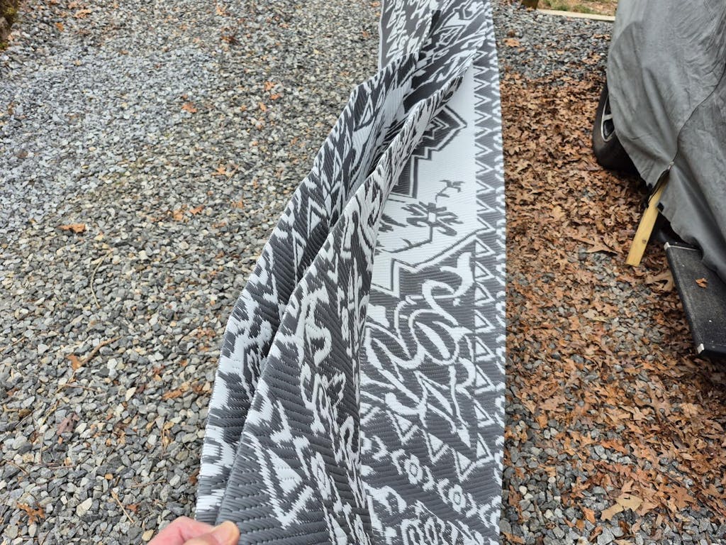Nice rug for use with our small camper. Being relatively stiff, it folds up neatly into a block that fits easily into the included bag. It's has a woven finish and appears to be easy to clean and will not attract or hold dirt and debris. It comes with pins, that will probably work OK, but considering the stiffness of the mat, should be a little heavier. The bag is very lightweight canvas material, again OK, but doesn't not look very durable in the long term. Overall, I like this mat rug.
