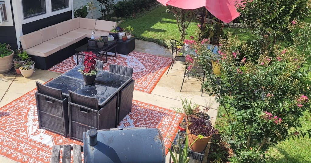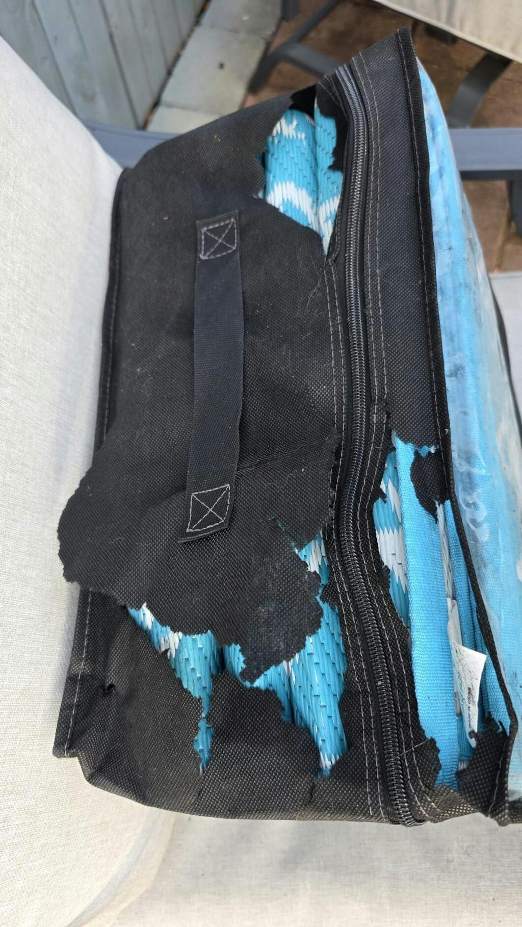 This is a good sized outdoor rug. I got it to put down at the entrance of my camper when camping. It's very light and comes with stakes that you will need to hold it in place, each corner has a stake loop sewn in for this purpose. This is an important feature and then something to consider when determining what you are going to use this rug for. If you put it on the deck or on a patio where you will not be able to stake it down, this rug is not going to stay in place with the slightest bit of wind. You would absolutely need to hold it down with patio furniture or something heavy. I had it out on my back patio with a patio paver block on each corner and a mild wind was still lifting it and moving it around. So if you think you're going to lay this down on an outdoor patio and it's going to stay in place on its own, it's not. So the mat itself, it comes all folded up. You lay it out and the creases from all the folds are permanent. That is good and bad. It's good because I am going to use it for camping and I need to fold it up for storage and transportation. With all the creases in place it folds nicely and then will actually fit into the included carry case. When I first unpacked the rug and I saw the included zippered carry case, my first impression was that, "This thing is NOT going to fit in this bag". But it did, see photo. Then the negative side of the creases is that again, they are permanent. When the rug is laid out it never actually lays completely flat and you can always see the creases. If I weren't needing to fold it up for camping and I just wanted it for a patio rug, I would not like all the permanent fold creases in it. It would be nice if they could provide and ship this rug on a roll instead of folding it for those that do not want it folded up. The product description says the crease is temporary and to give it time. I laid this out on my patio in 90 plus degree weather all day, held down with patio pavers and the creases never did go away completely. Perhaps after several days it would get better. Just something to be aware of so you know what to expect. The rug came out with a strong smell but quickly dissipated and being outdoors did not become an issue for me. I love the huge footprint, the storage bag and stakes, the material is comfortable to walk on with the weave of the rug and composition making it durable as well. The design and colors are great. It seems that with a little care it should be durable enough to last a while. The small one is pretty good size and they come even bigger if that is your need. At the price point, I felt it was well worth the cost.