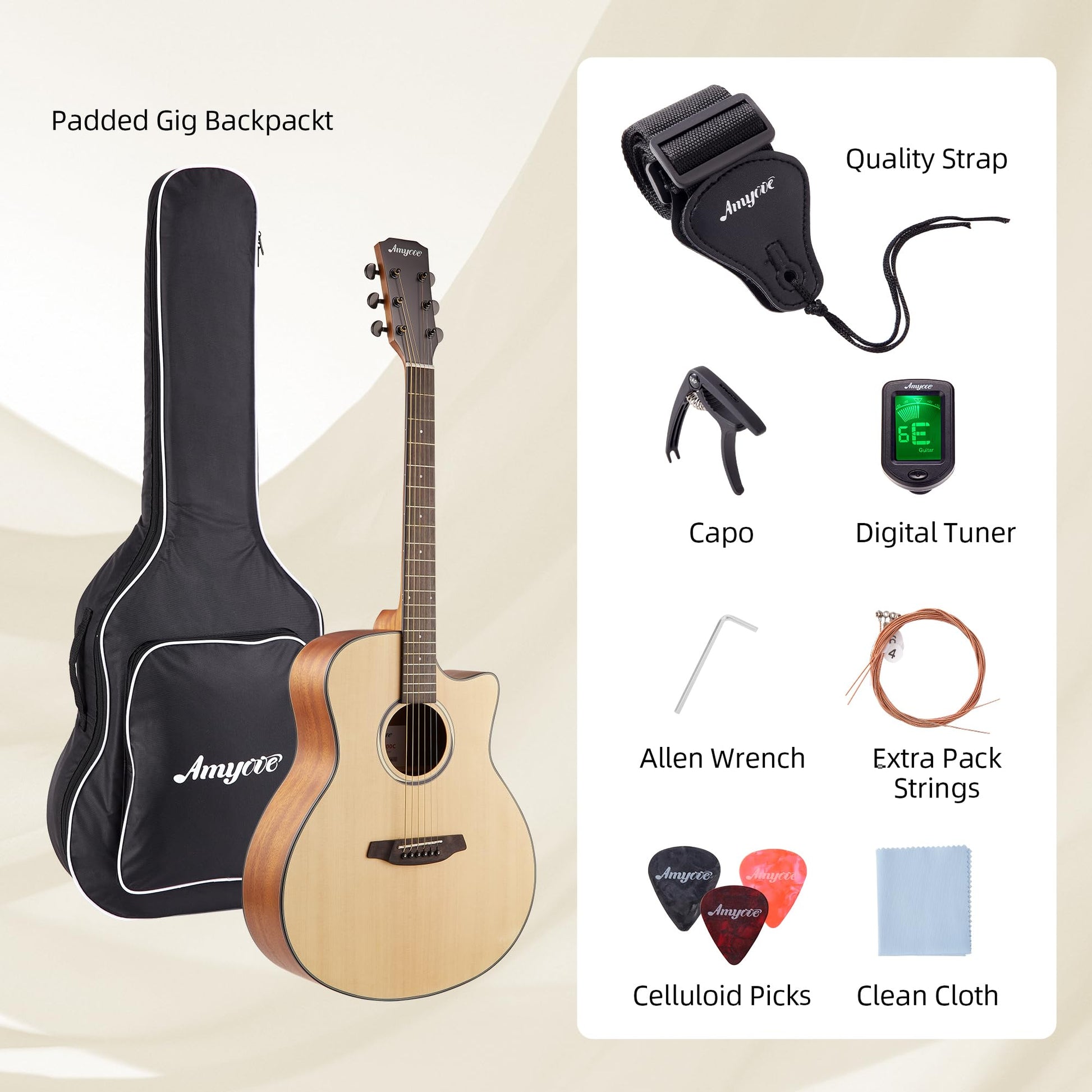 Our acoustic guitar kit comes with everything you need to start playing immediately. The upgraded gig bag, tuner, strap, strings, picks, and capo ensure you're fully equipped for your musical adventures.