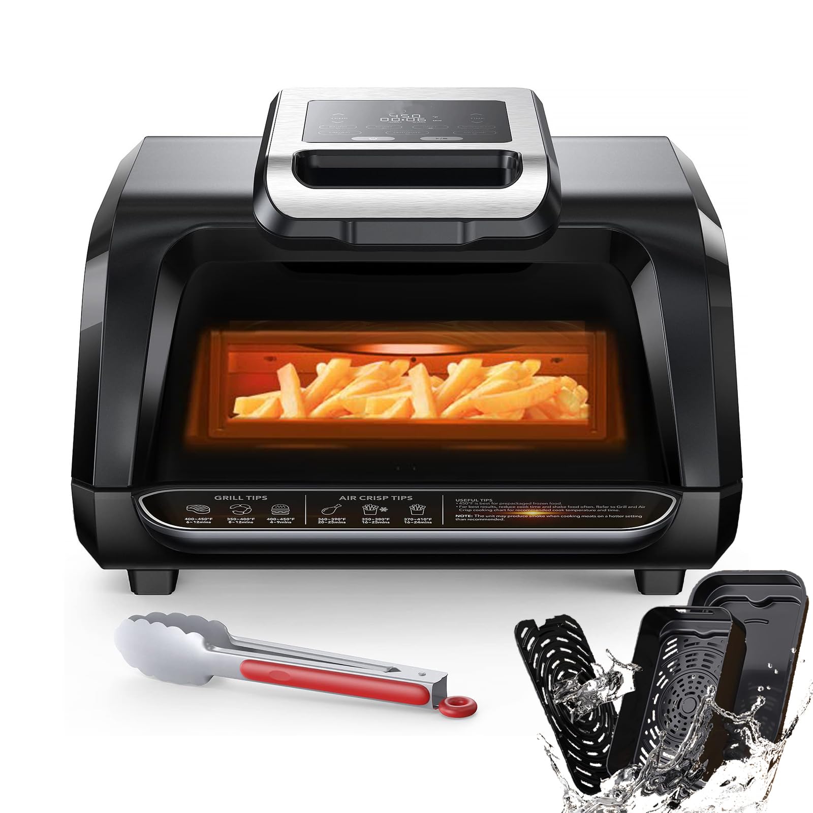 User-friendly indoor grill/air fryer combo with built-in cooking tips. Includes tongs for safe food handling.