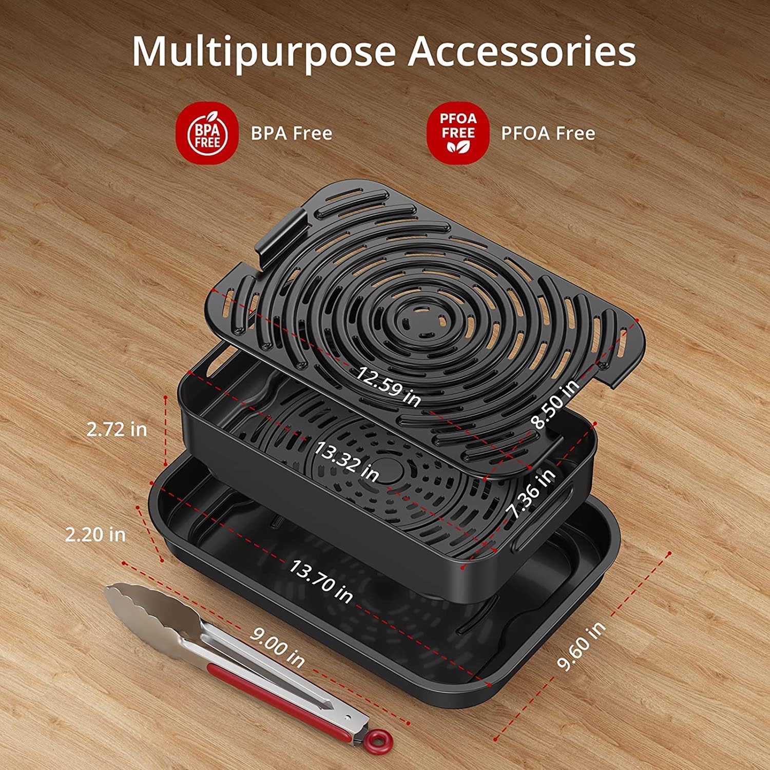 | Package Contents | 1 x Air Fryer 1 x 9" Silicon Tongs 1 x 13" Cooking Pot 1 x 8.5" x 12.5" Grill Grate 1 x 4-qt Crisper Basket |