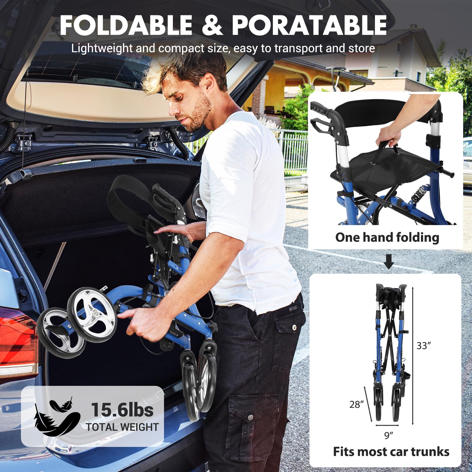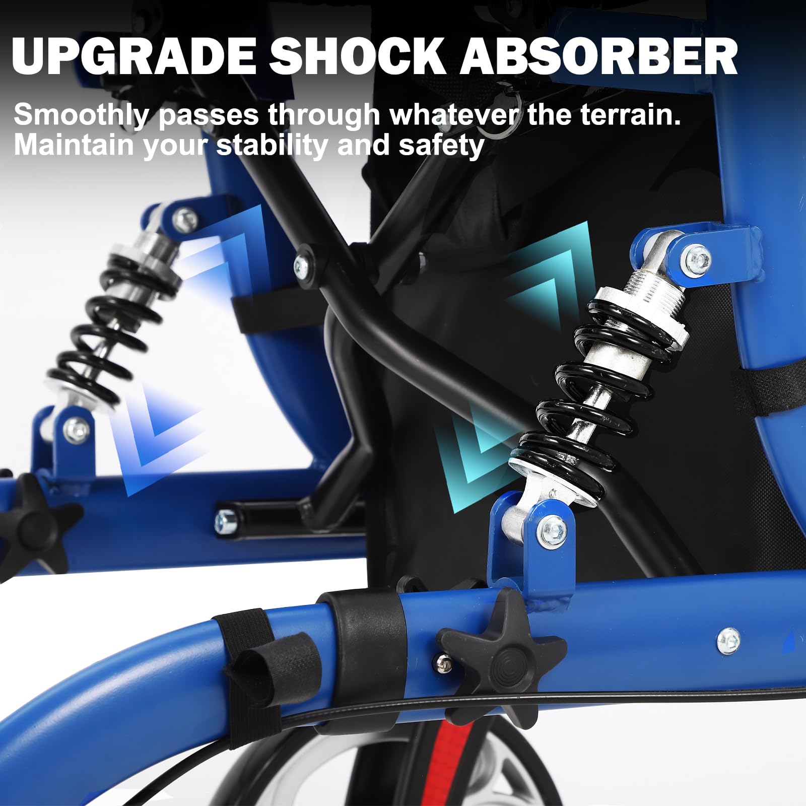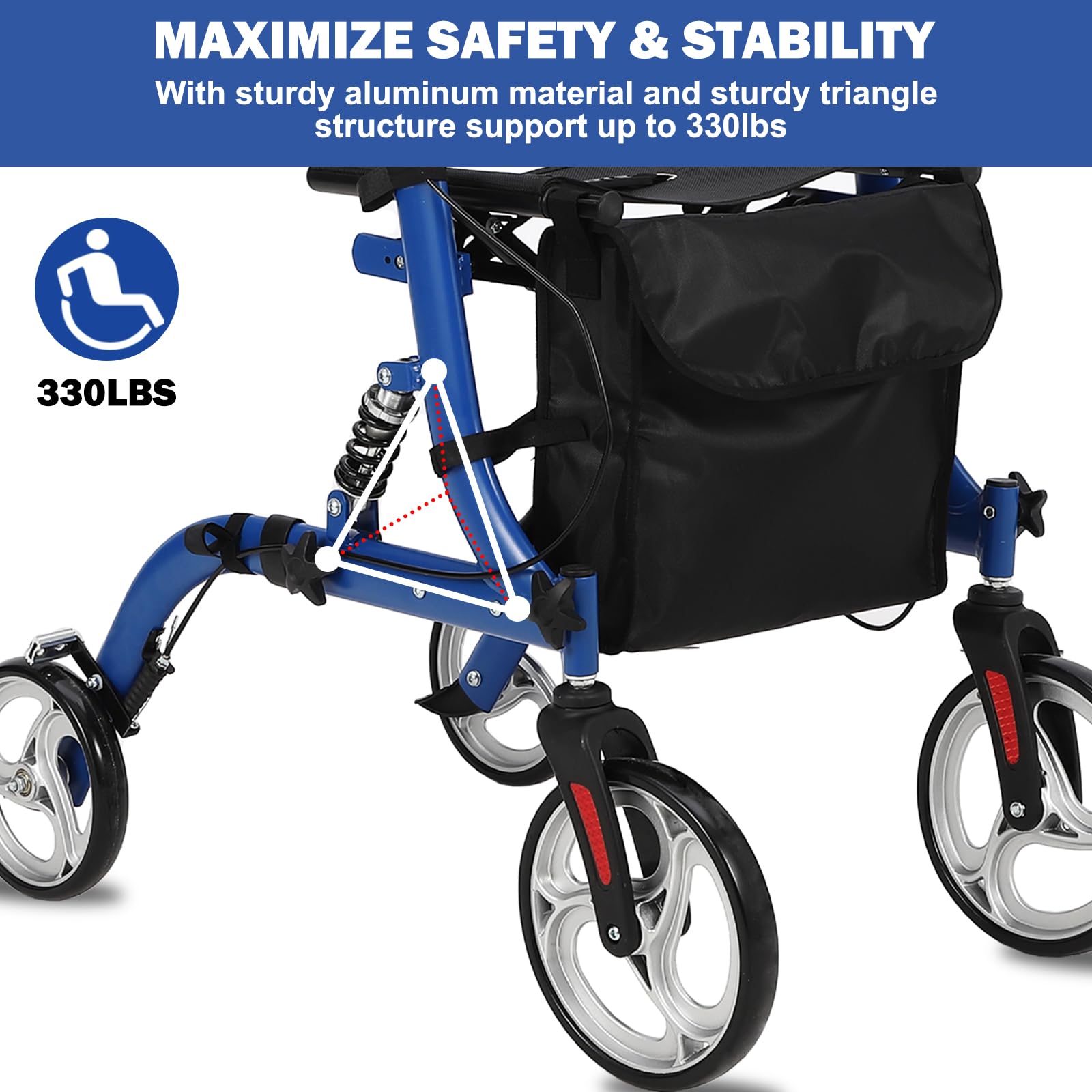 Garvee Rollator Walker for Seniors with Seat & Storage Bag, Shock Absorber, 10" & 8" All-Terrain Rubber Wheels, Lightweight Aluminum Foldable Walker with Backrest, Adjustable Height 34-40", Blue