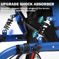 * Advanced Shock Absorption System: Features large rubber wheels (10" front, 8" back) that navigate smoothly over rough terrain, complemented by 2 powerful shock absorbers that maintain stability on bumpy roads and provide cushioning when seated.