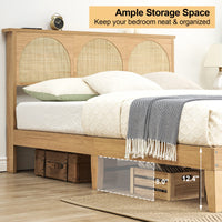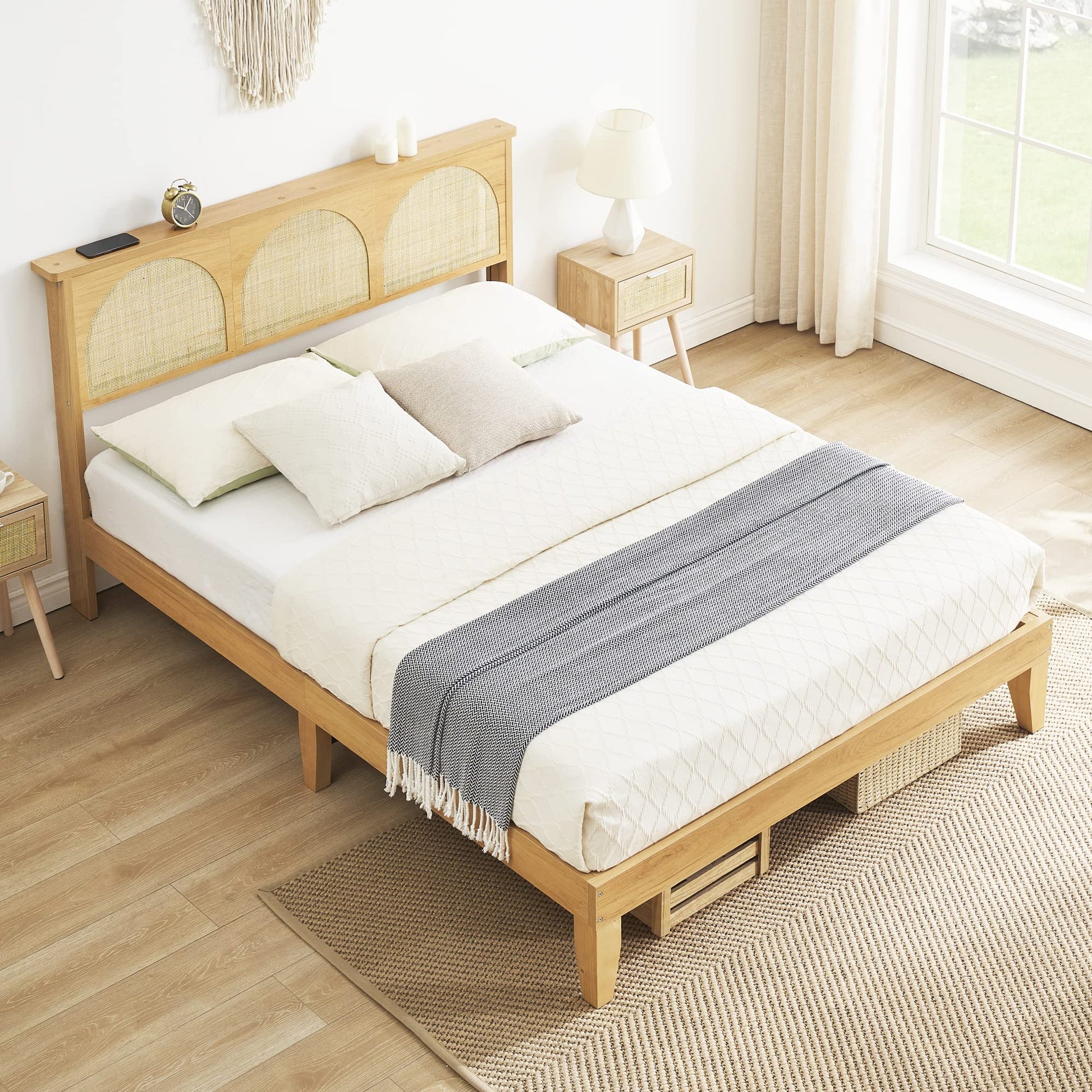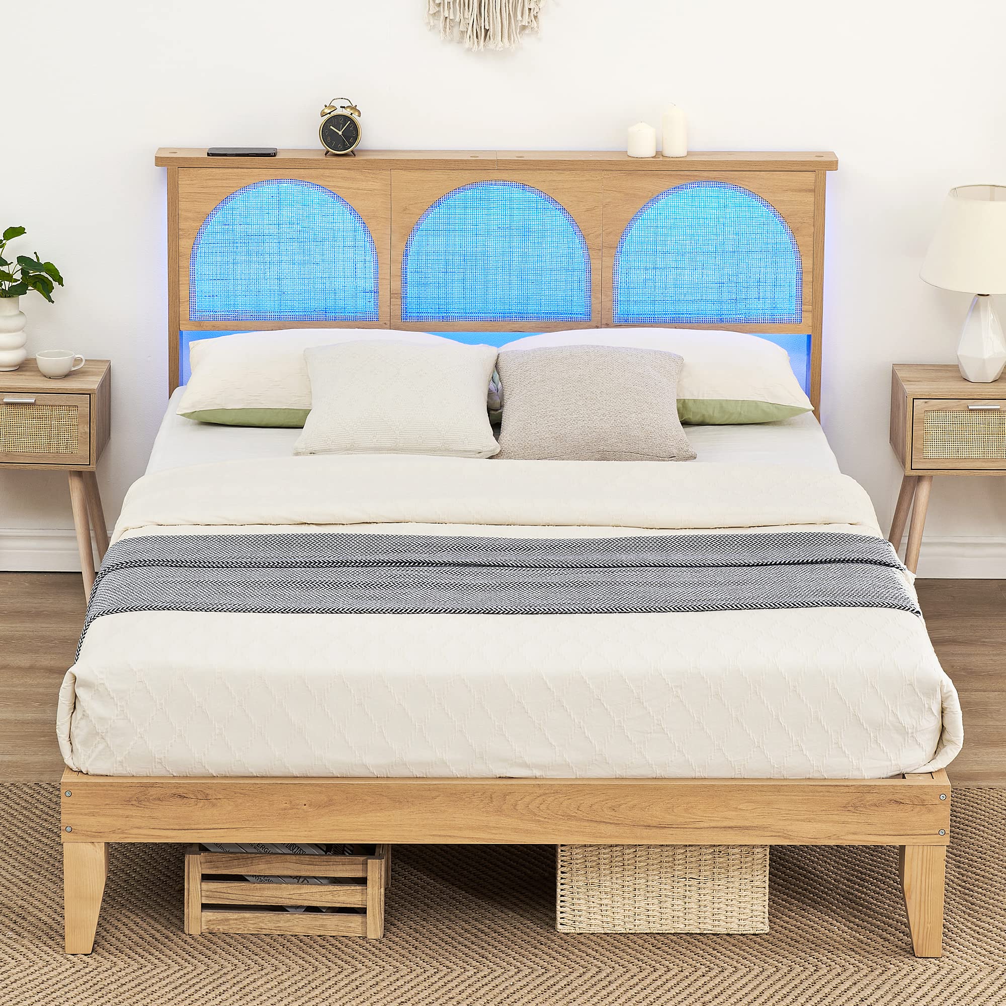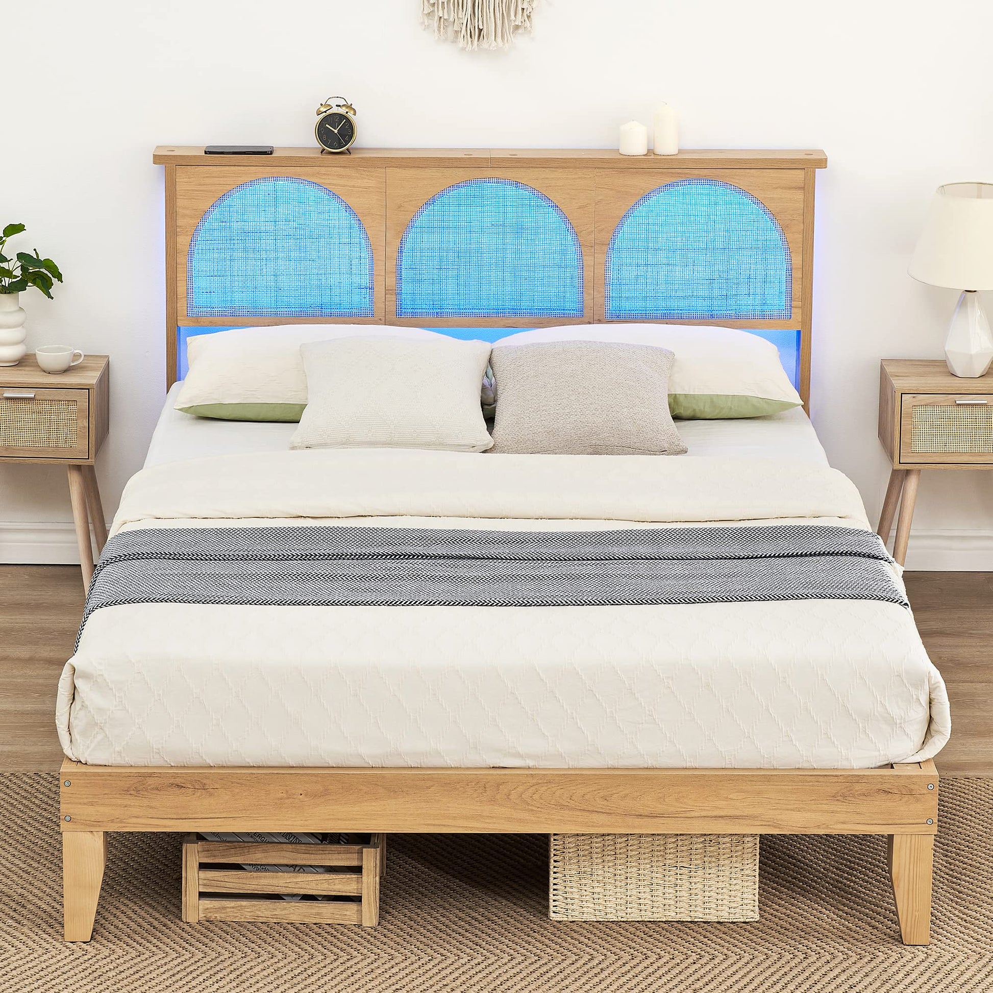 Garvee 12.4" Deluxe Solid Wood Queen Bed Frame with LED Lights & Rattan Headboard, Wooden Legs, Modern, No Box Spring, Easy Assembly