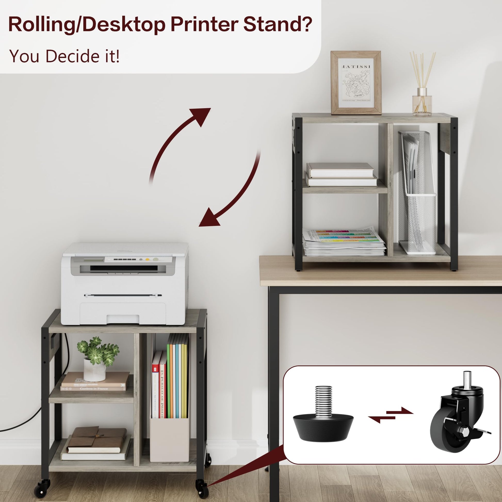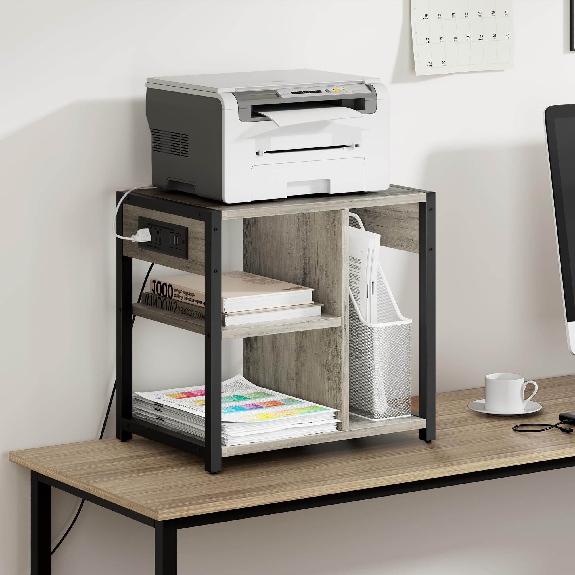 Garvee Printer Stand with Charging Station, Home Office Desktop Printer Stand with Storage, Under Desk Printer Table, 3 Tier Heavy Duty Rolling Printer Cart with Wheels for Small Space, Grey