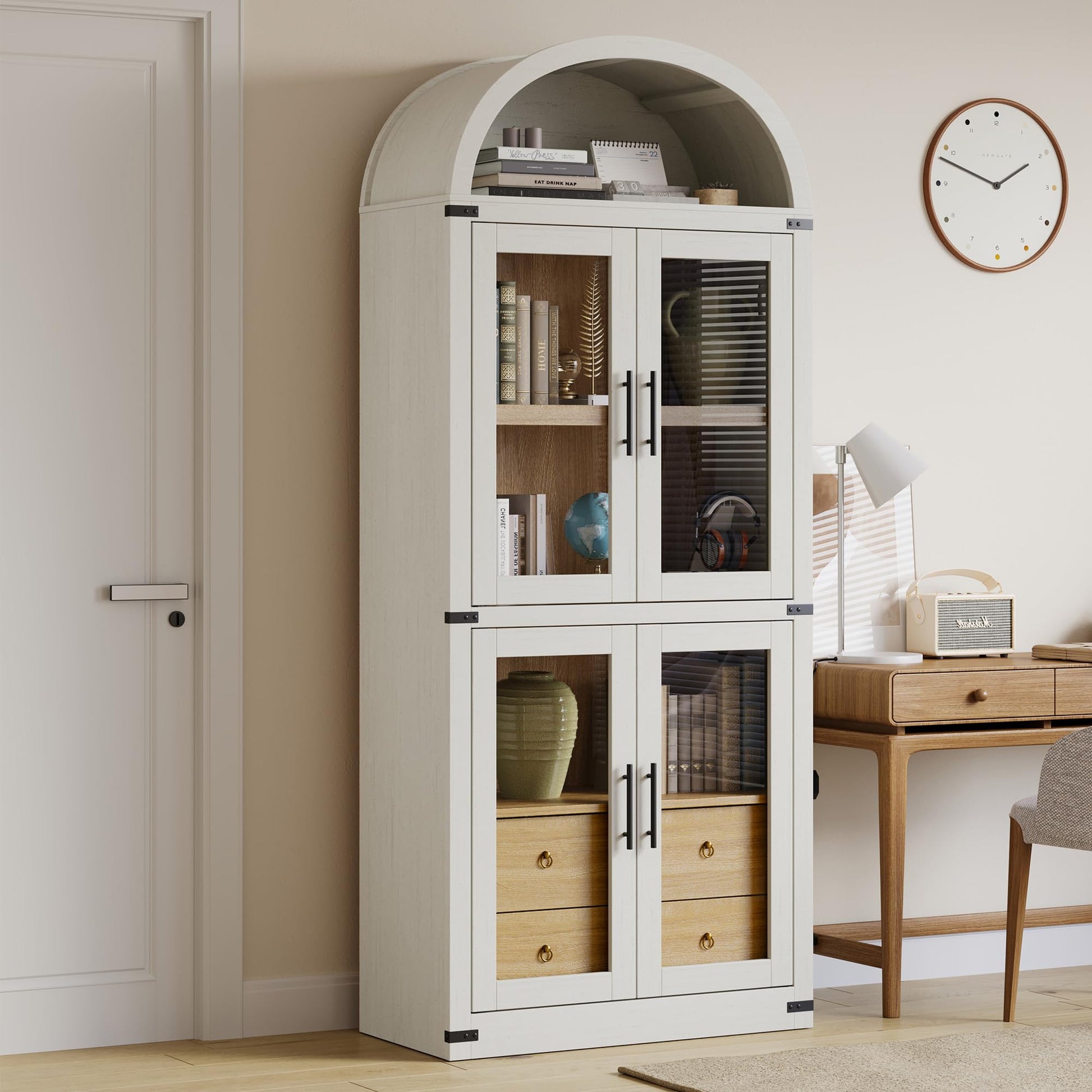 - Multi-Functional Use: This arched cabinet with doors and drawers adapts to diverse needs, It can be used as a kitchen or dining room pantry cabinet, an open display rack of collections in your living room, or a bookshelf in the study room or home office. It also fits perfectly into the bedroom, dining room, apartment, bathroom, balcony, and any other space.