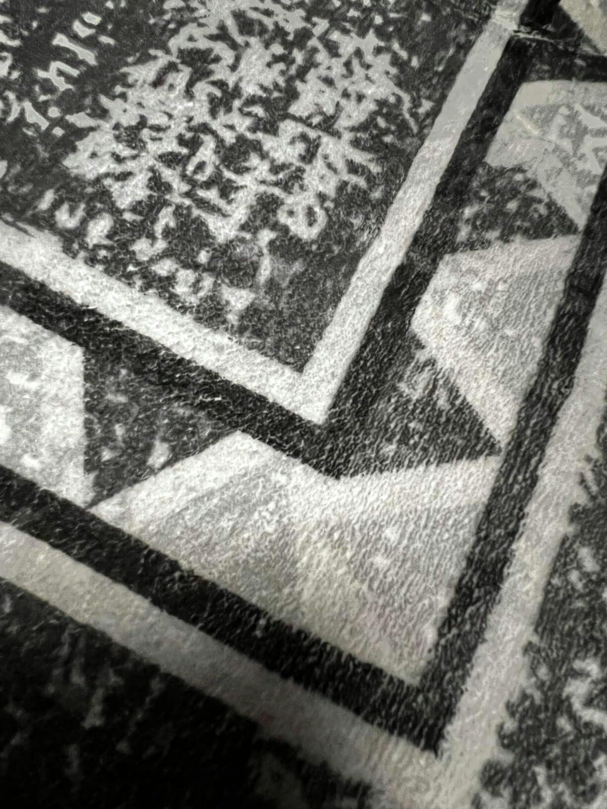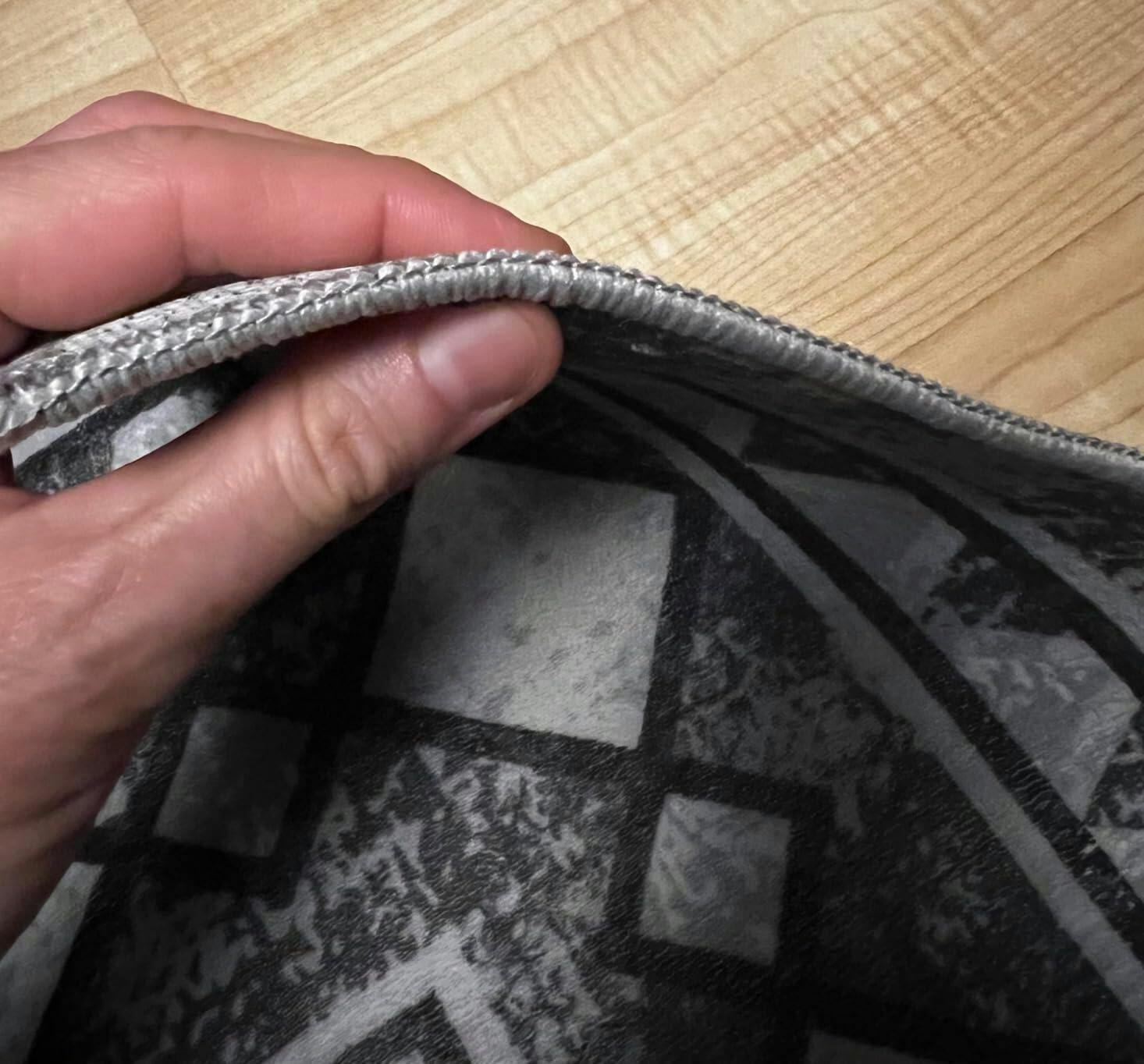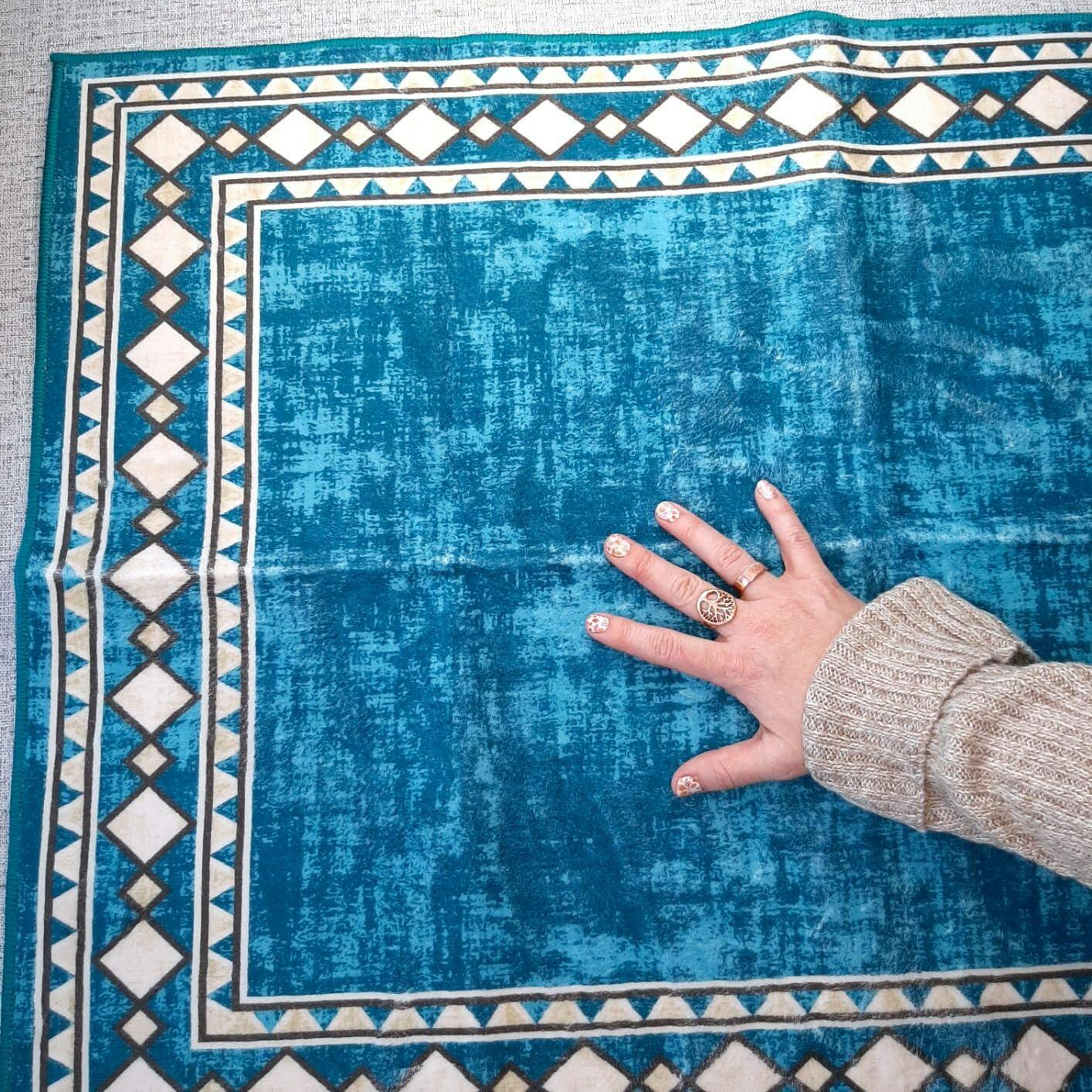 This rug is flat(not wrinkled), soft and stays in place(doesn’t slip). It’s also easy to sweep and it’s just as vibrant/beautiful as the advertised photo. It is the actual size it says it is too. So far, I have no complaints!
