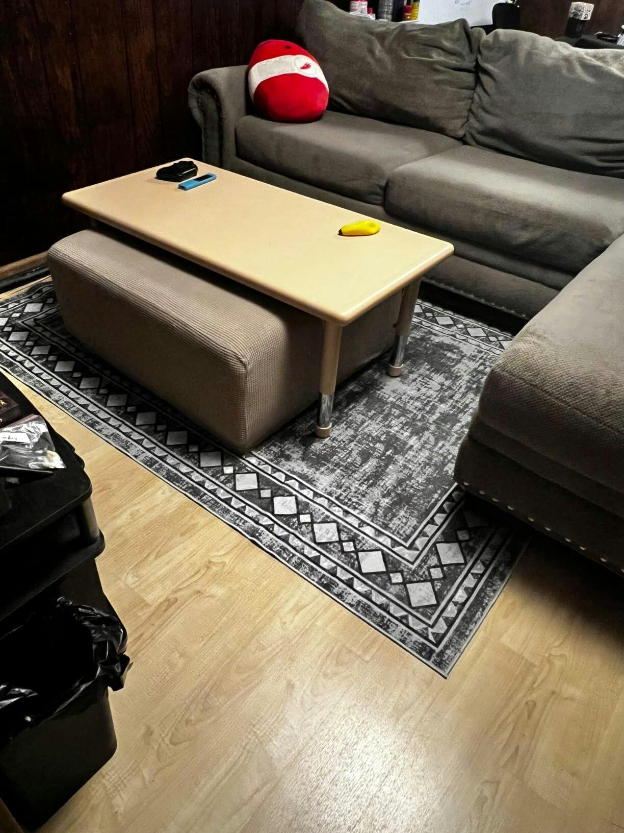 This is a nice thin, lightweight rug. I do have furniture on it, but it doesn’t move around. It is easy to clean, but I have to use my canister vacuum on it because the upright vacuum will just suck it up. The color or print looks faded or has a worn look to it so I’m not sure if I would put this in my main living room. I have this in my sons room so it looks great and works great for him.