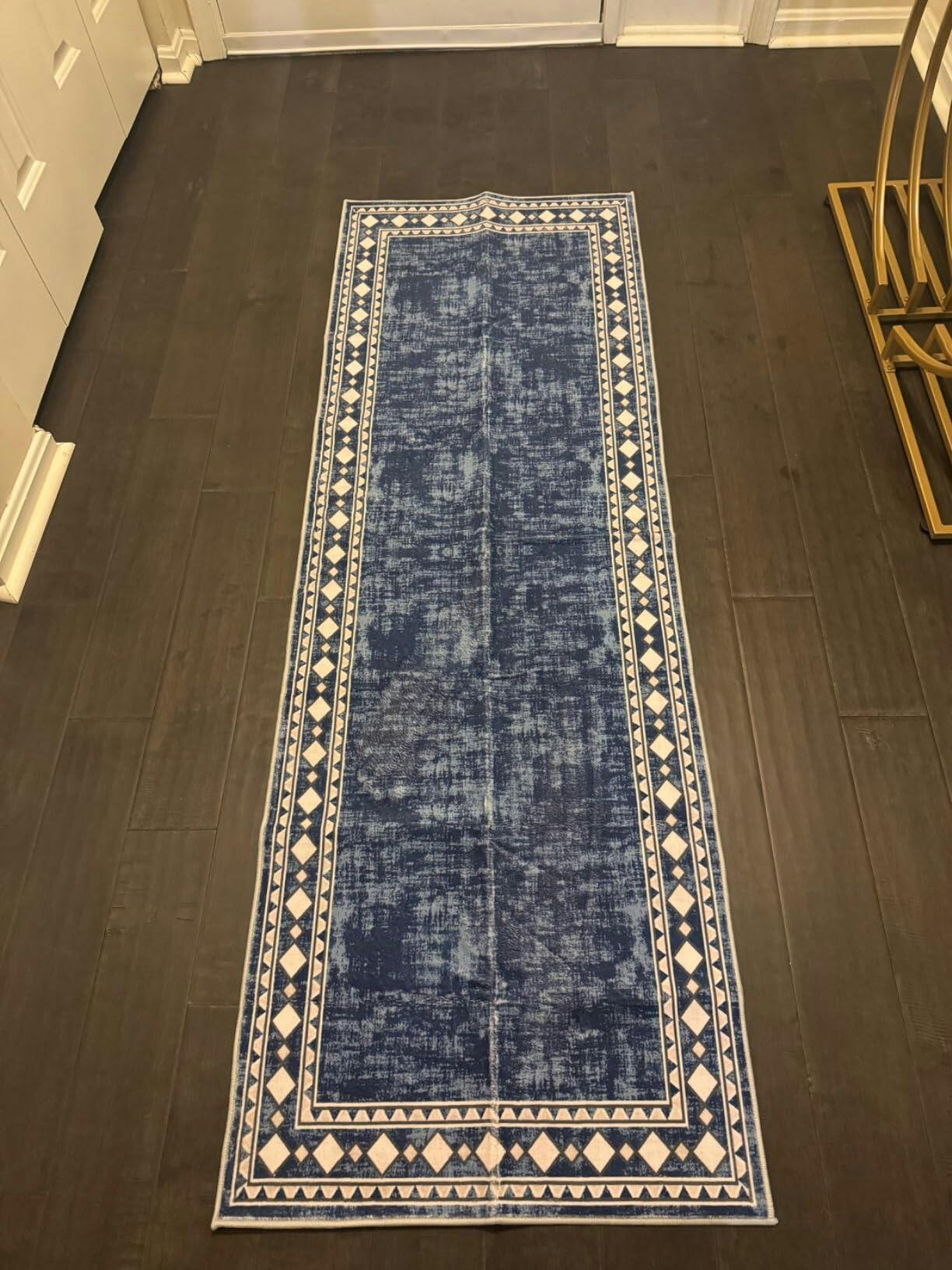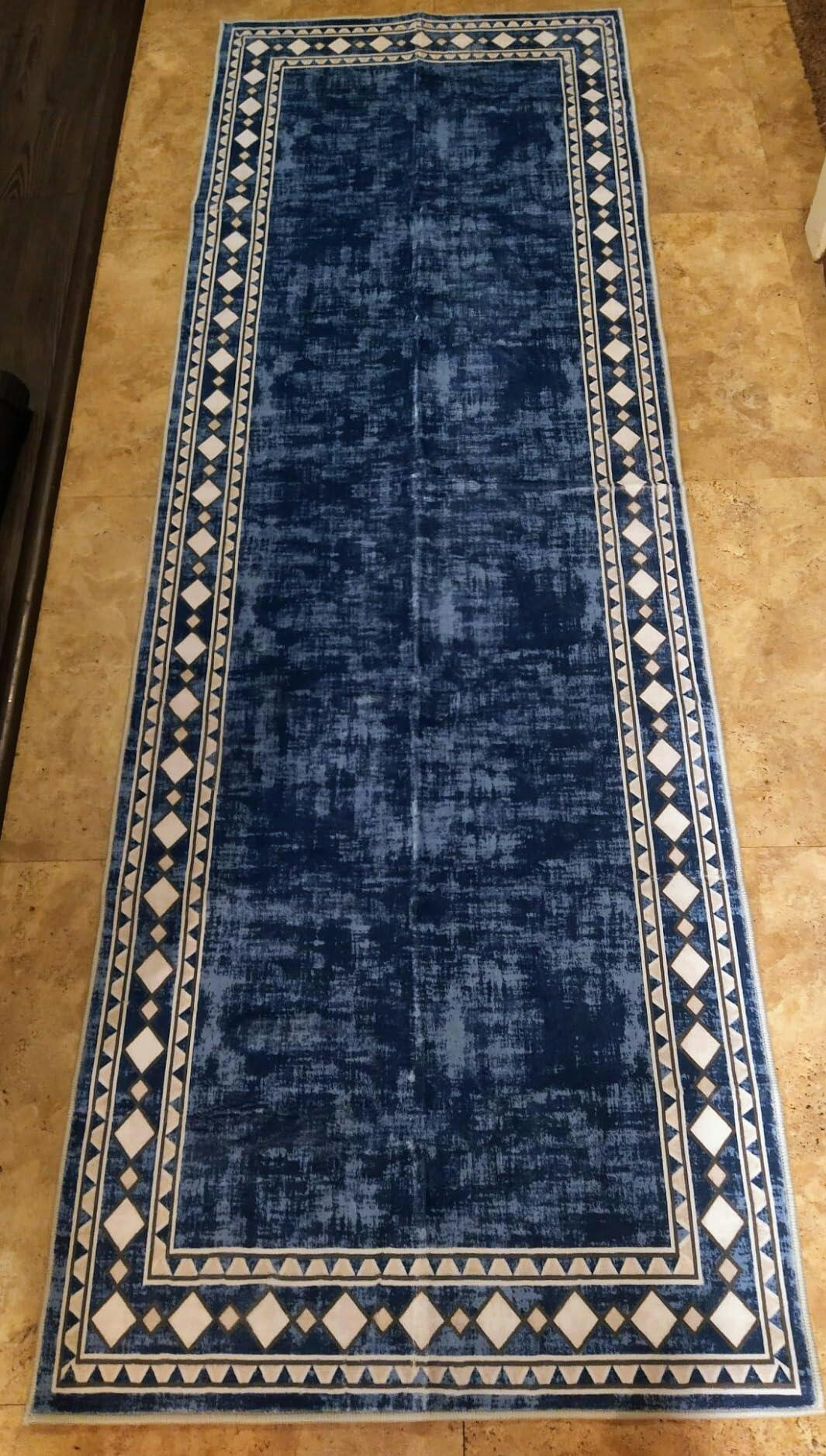 This rug is soft, and thin. It has non-slip tread on the bottom that works. I have this runner in my front hallway so it gets walked on a lot. Yet, it stays in place. The pattern is pretty, and the deep navy blue really brings out the decor. This is an excellent runner rug.