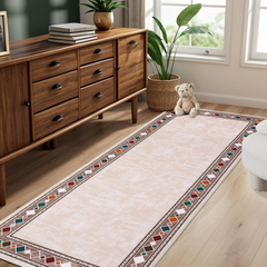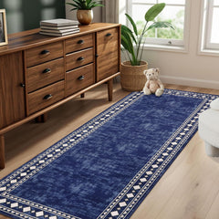 Modern area rug features a classic bordered pattern design to add visual interest to your space. The low-pile carpet has a soft, flat texture that feels very comfortable on your feet, you and your children can play and rest on the area rug, enjoy the comfort from this rug, have a beautiful and warm day.