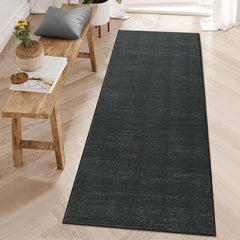 I like the drama of black rugs, but solid colors tend to show every speck of lint, so this one with its gray woven effect is a better choice for disguising debris. The thinness of this area rug is perfect for layering over carpet, which I like to do as a style element, especially in my bedrooms. The light weight of this area rug makes machine washing a breeze, but vacuuming can be problematic. I found that taking them outdoors for a good shake works better, and anything that doesn't shake off, because of the smooth surface can be easily swept up with a broom and dust pan.