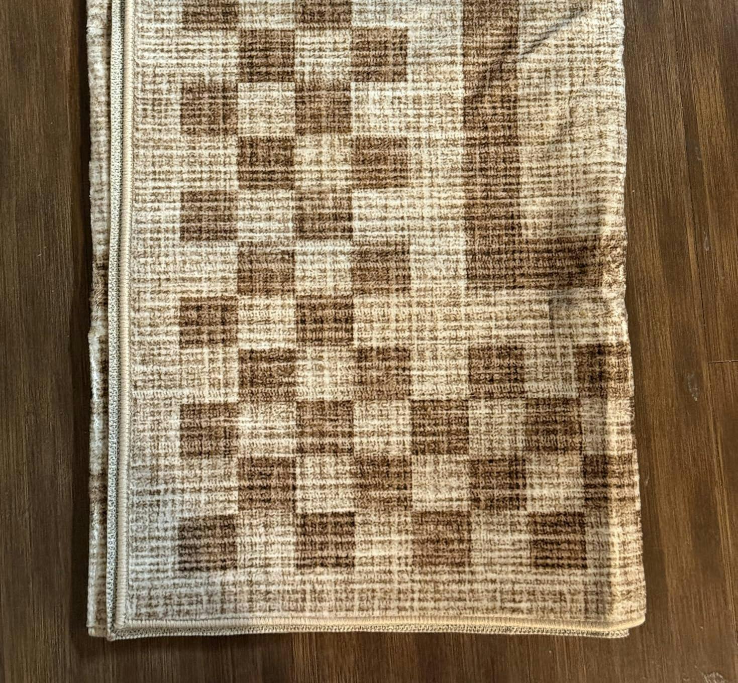 Brown rugs fit in well with a wide variety of decor, especially with brown furniture. The checkered pattern draws the eye to the edges and creates a feeling of space in the center. This rug fits easily into our very ordinary washing machine and stays where it is put. Altogether this is a great buy.