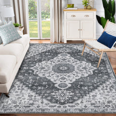 Garvee Large Living Room Rug 9x12 Washable Rug, Non Slip Non-Shedding Vintage Carpet, Low Pile Oriental Medallion Floral Printed Rug, Soft Foldable Rug for Bedroom, Gray