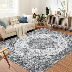 Garvee Area Rugs 3x5 Kitchen Rugs Non-Slip Washable, Low Pile Floral Vintage Distressed Medallion Carpet, Stain Resistant Foldable Floor Mats for Bedroom, Dining Room, Living Room, Grey