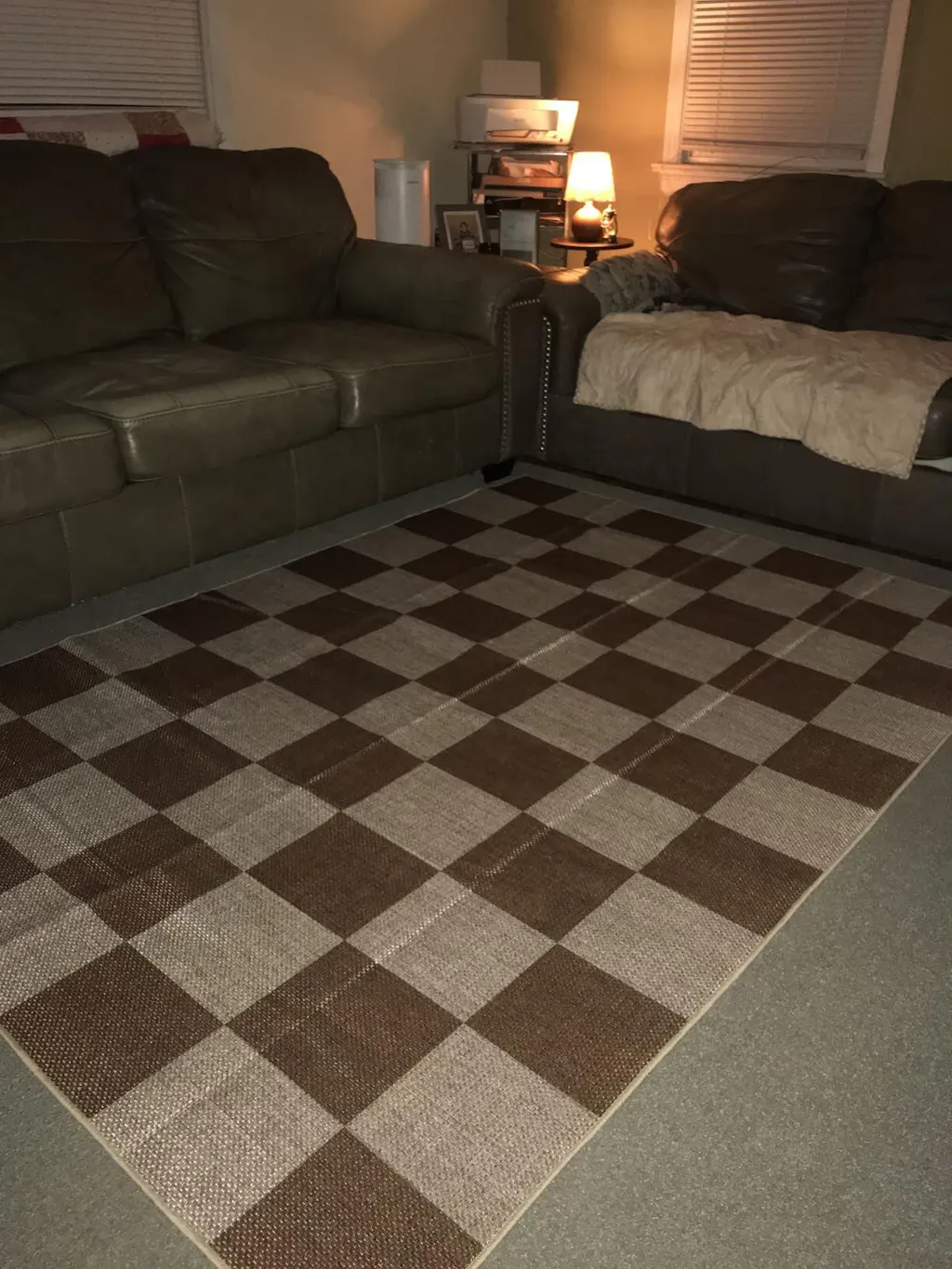 This checkered 5x7 rug looks amazing in my living room! It came folded neatly and does have a few creases in it due to storage and packing but I expect they will flatten out with use. I find the quality commensurate with the price. This is a thinner carpet but feels sturdy and easy to wash. Like you could use a carpet cleaner on it or spot wash just fine with no problems. I think it’s a good product and I would totally recommend it. Looks awesome.