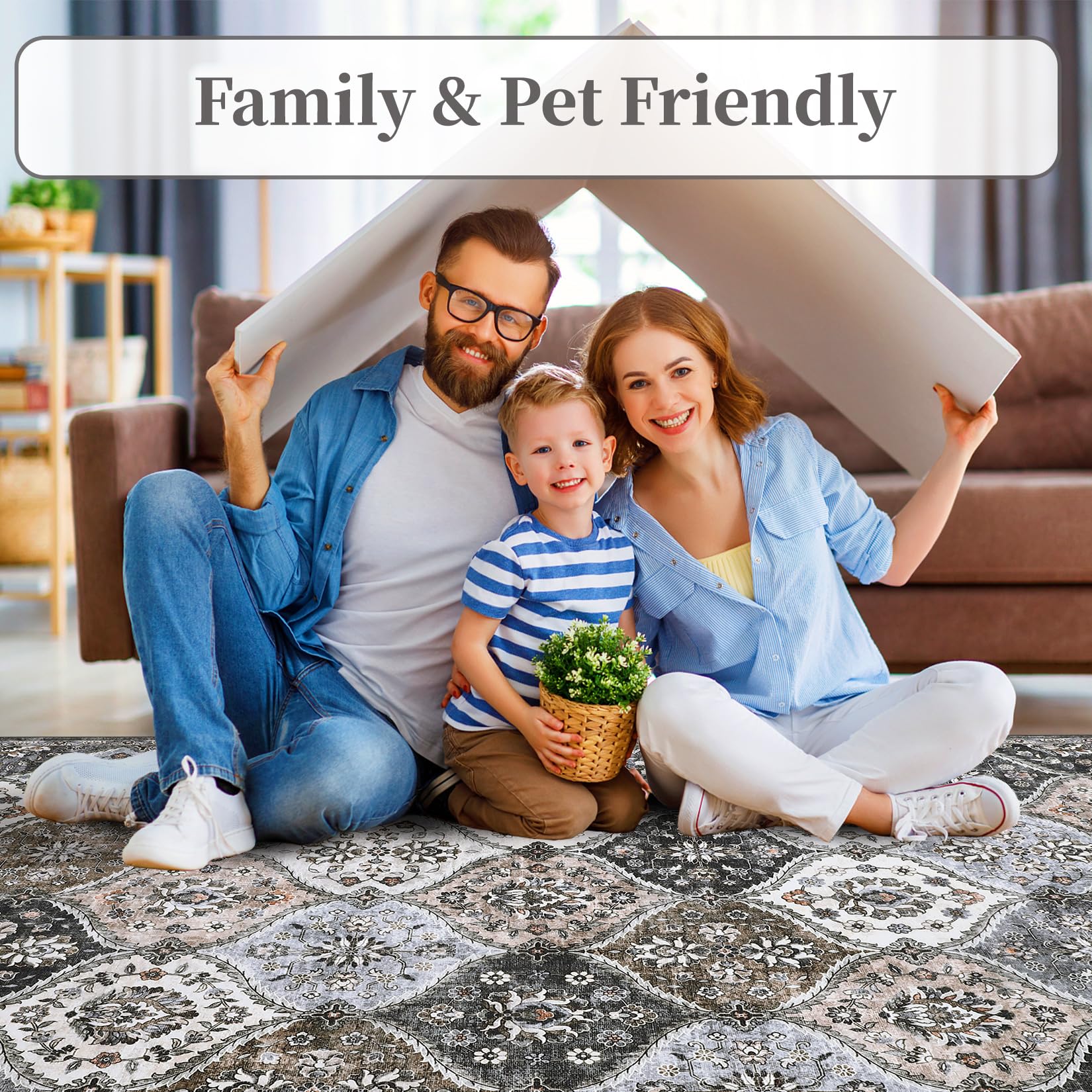 The washable rug is an ideal base for high-traffic areas such as the entrance, living room, dining room, kitchen, and hallways.