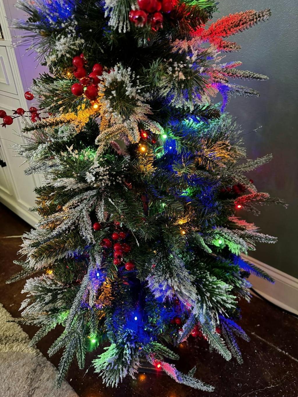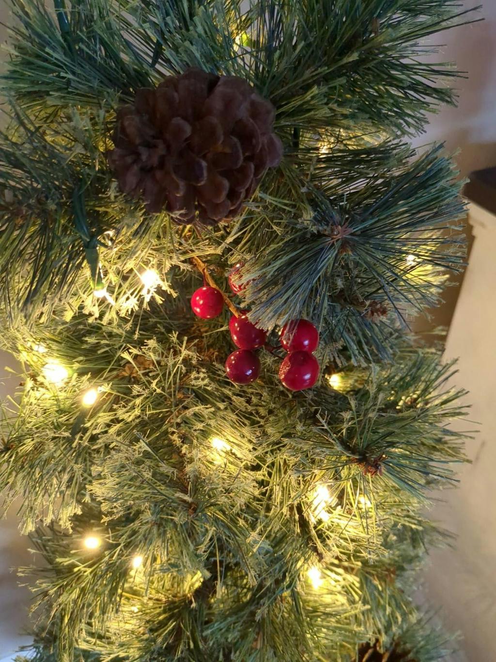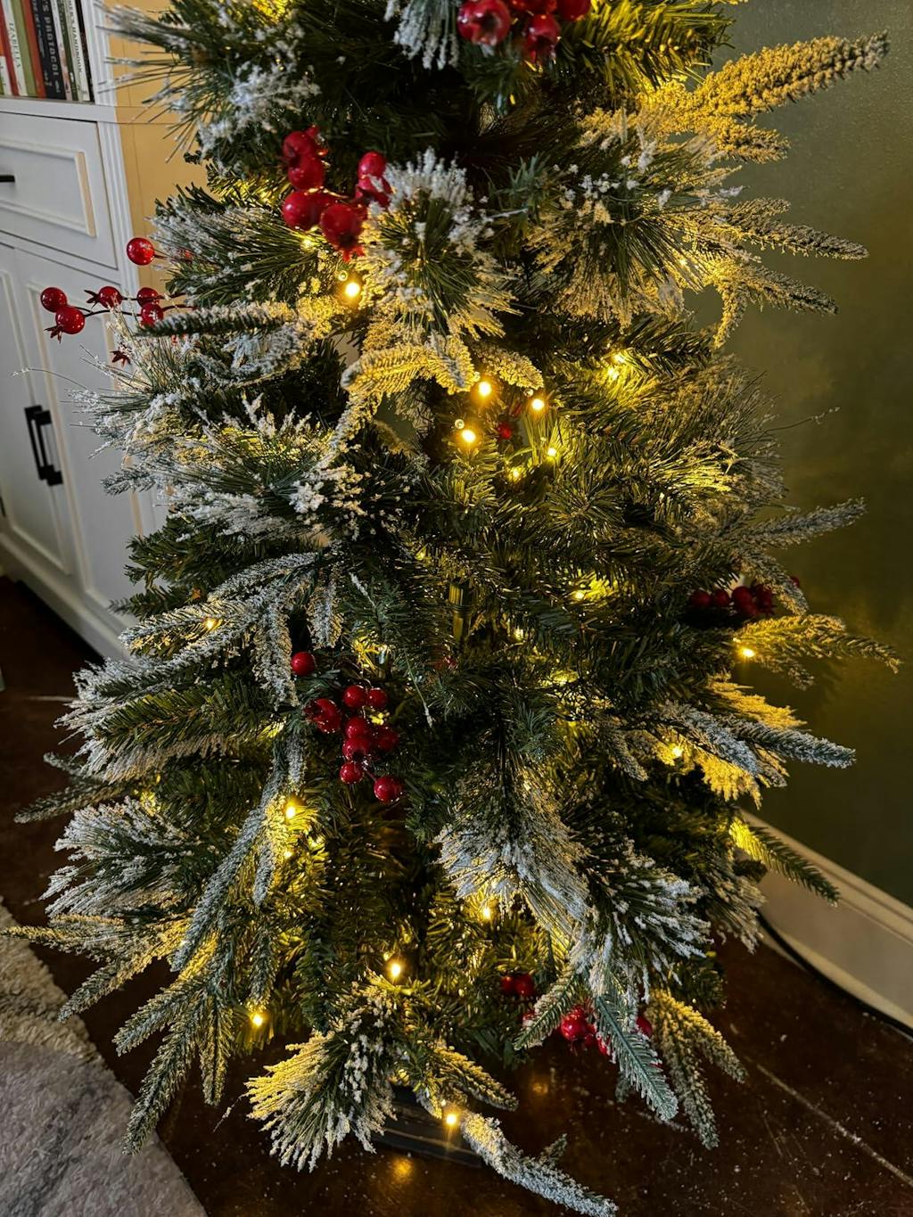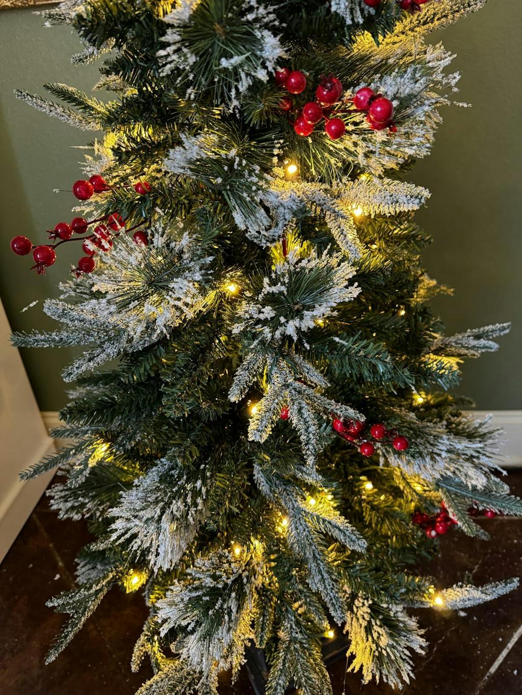 This artificial Christmas tree combines the beauty of snow-flocked pine branches with the festive touch of pine cones and red berries. The warm white LED lights create a cozy ambiance, perfect for both home and office environments.