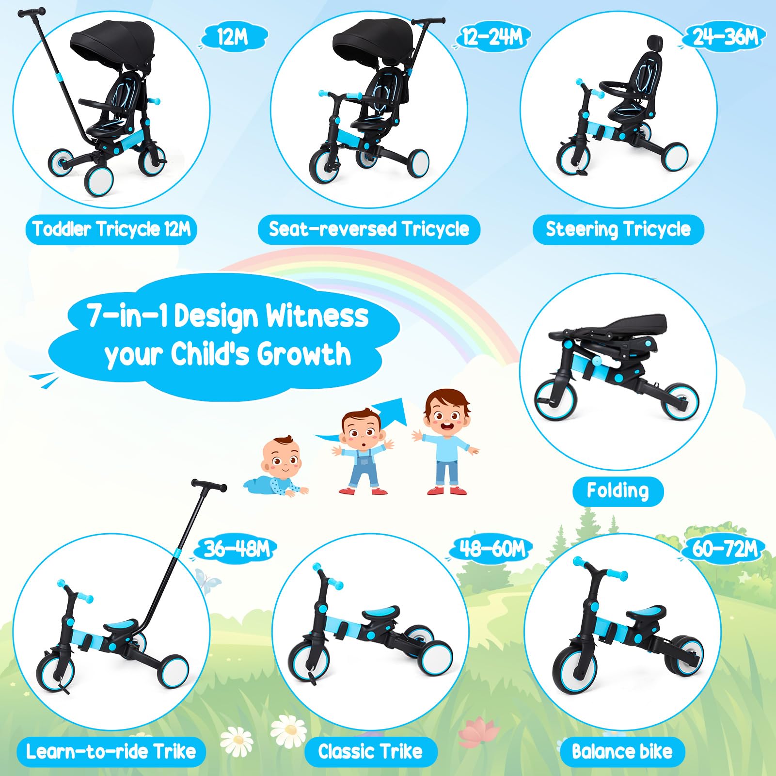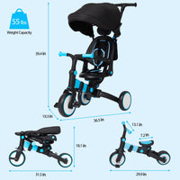 Garvee 7-in-1 Foldable Baby Tricycle with Adjustable Handle, Removable Pedal, Canopy & Guardrail, Aluminum Frame, for 12-72 Months (Blue)
