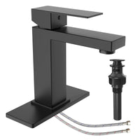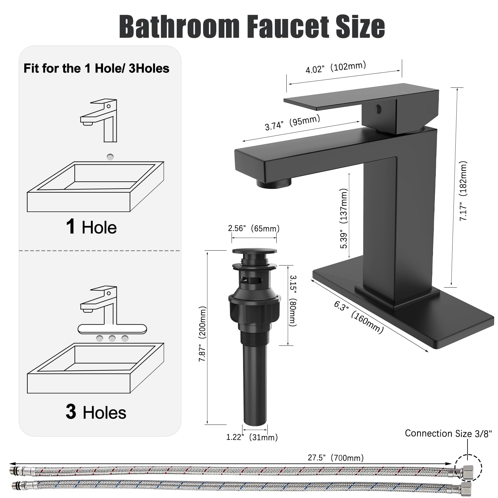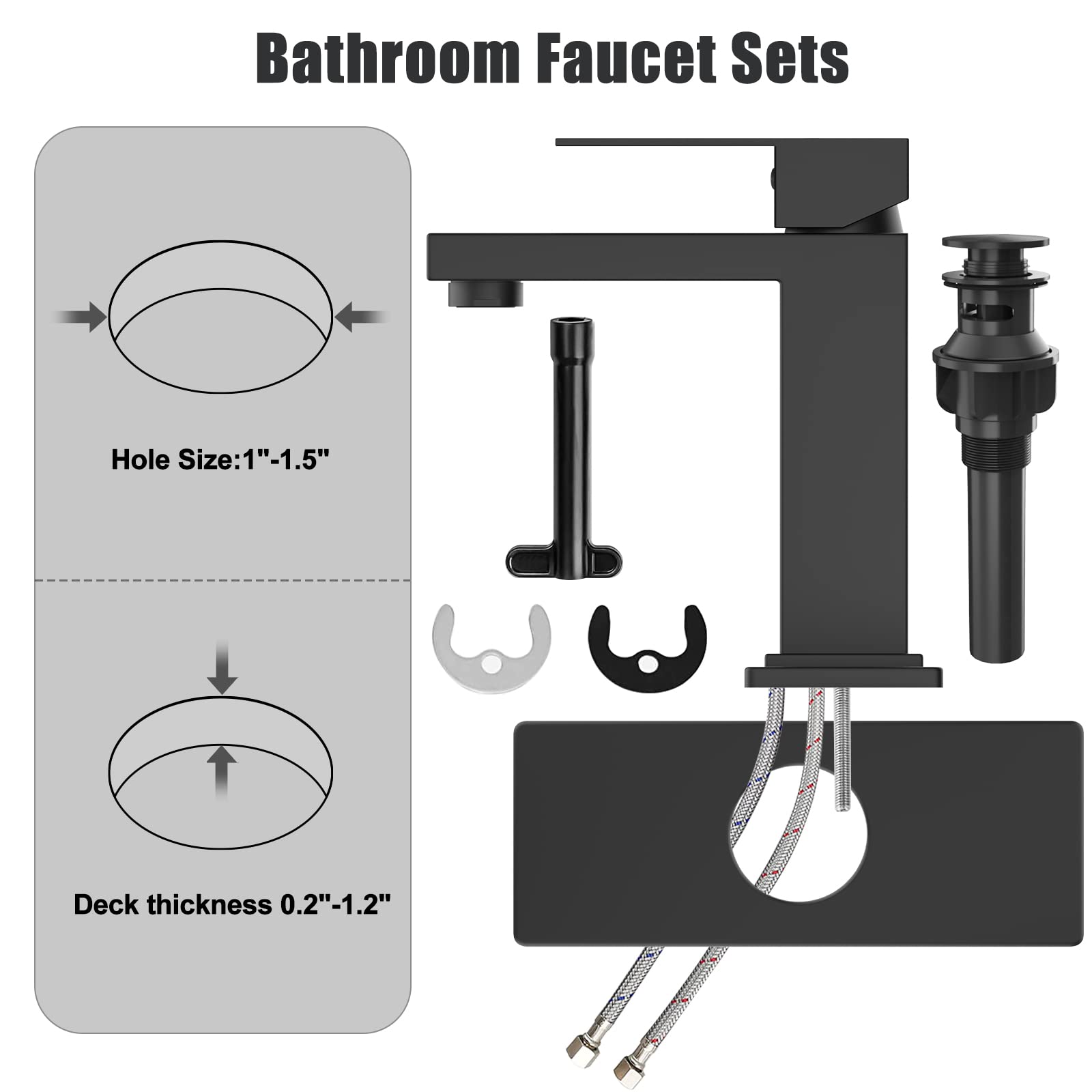 Garvee Bathroom Sink Faucet, Matte Black Bathroom Sink Faucet for 1 or 3 Hole with Pop Up Drain Stopper and Water Supply Hoses No-Lead Modern Single Handle Bathroom Faucet (Deck Plate Included)