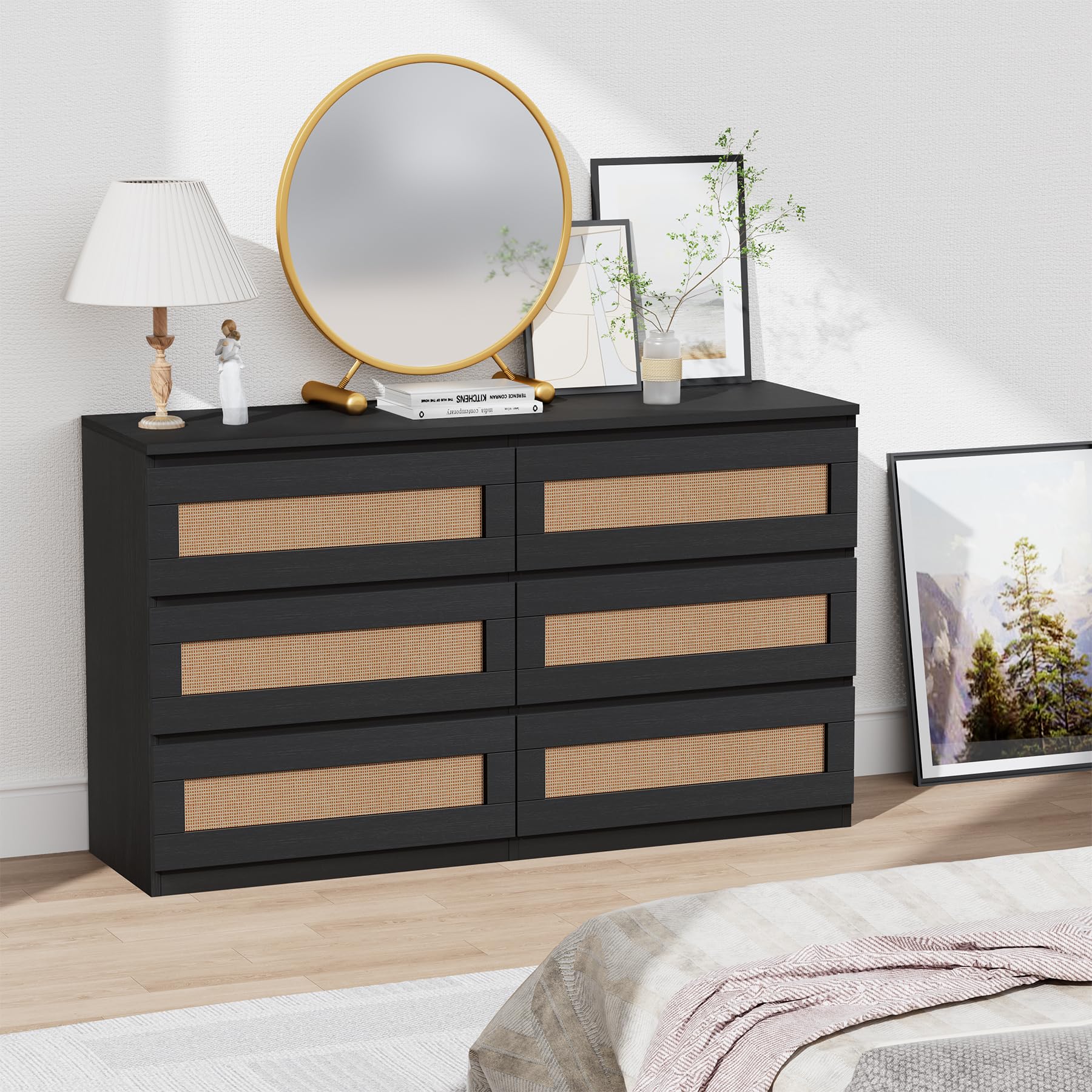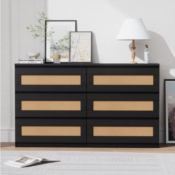 Garvee Modern Rattan Dresser for Bedroom - 6 Drawer Double Dresser - MDF Wood, Anti-Tip Kit - Smooth Metal Rails - Black - Ideal for Living Room, Hallway