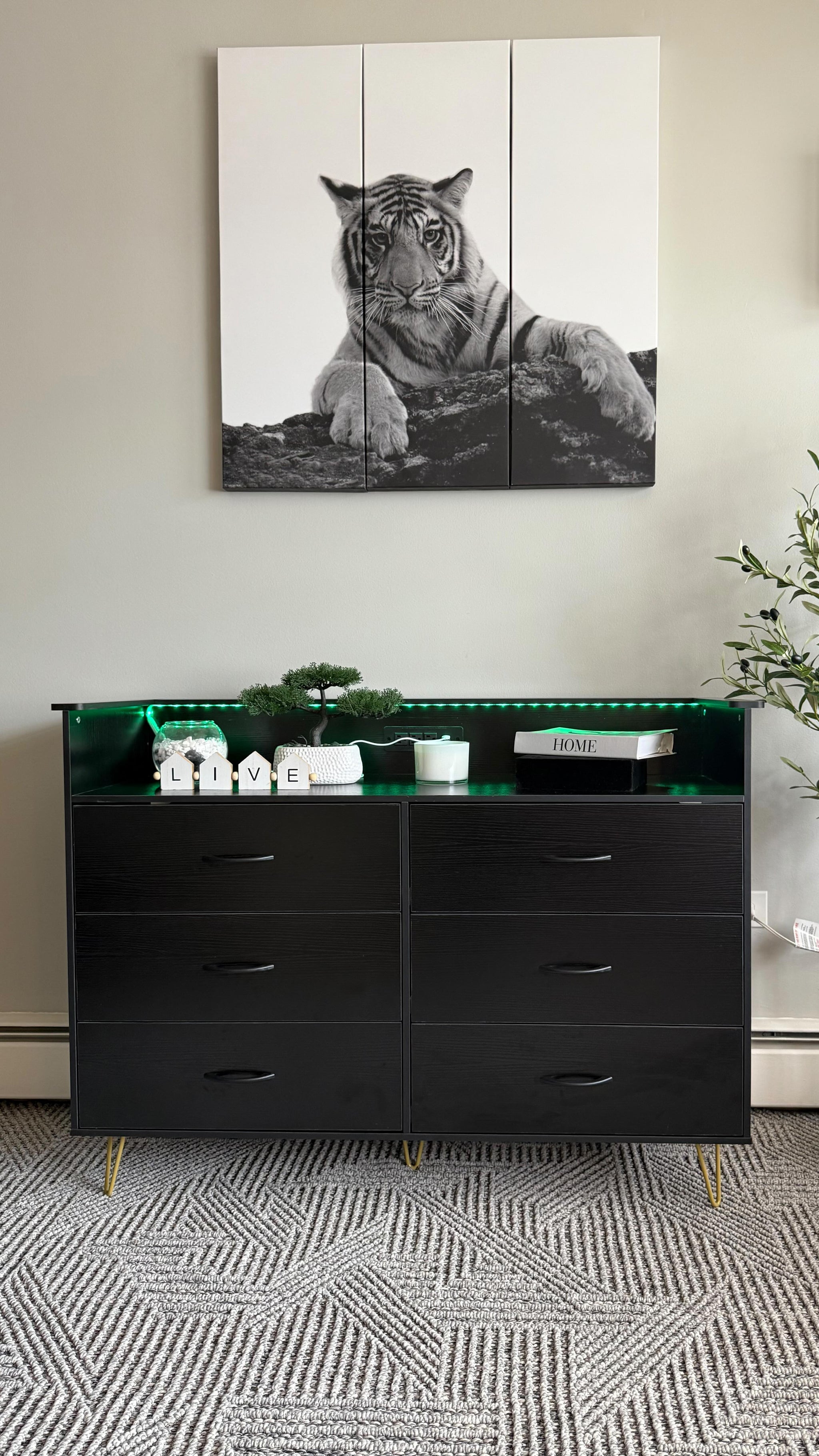 With its sleek black finish, LED lighting, and integrated charging station, this dresser combines style with functionality. The durable construction ensures stability and longevity.
