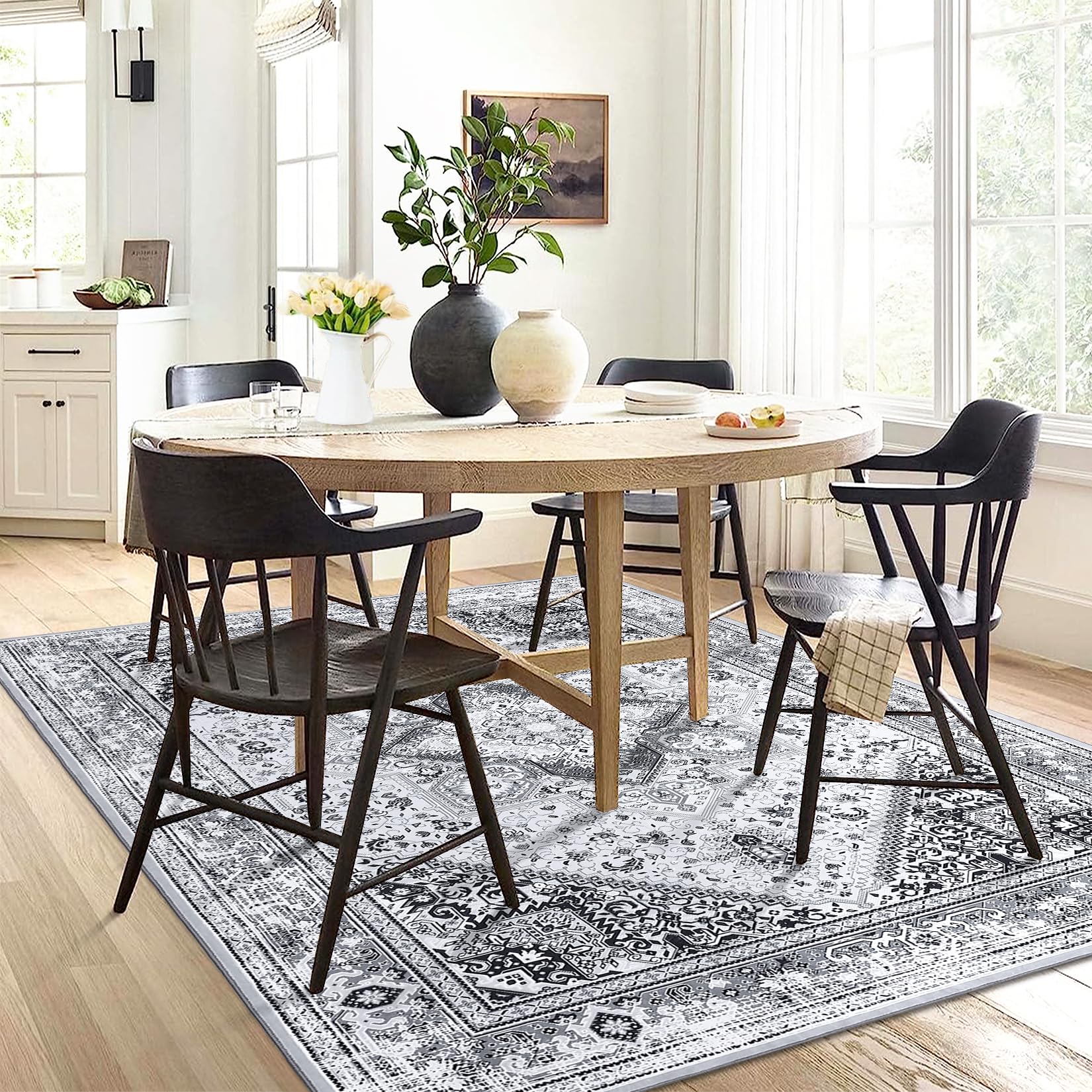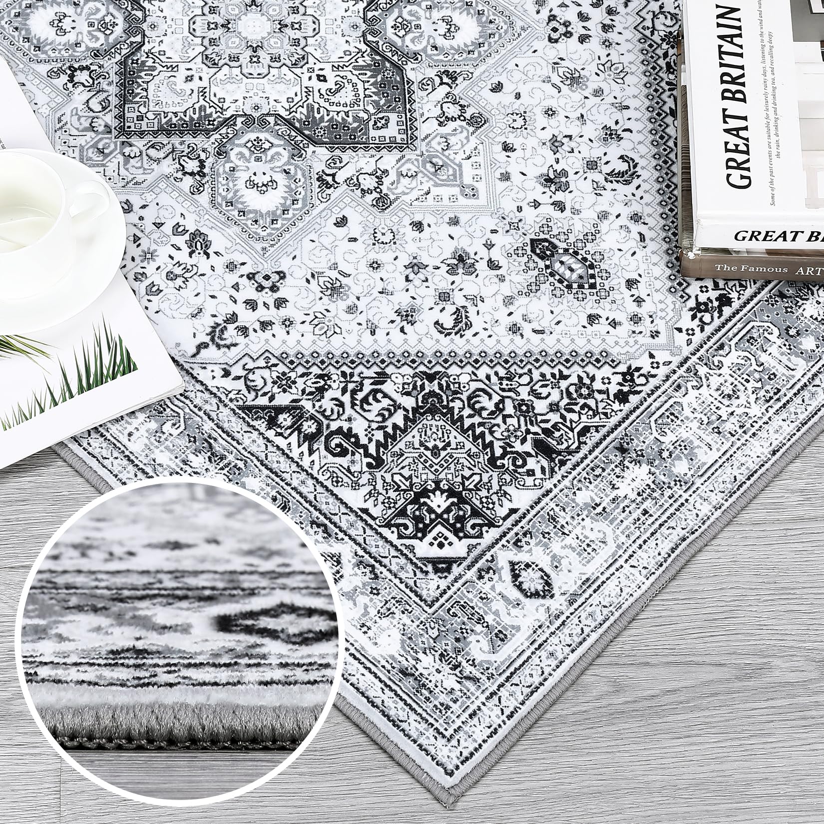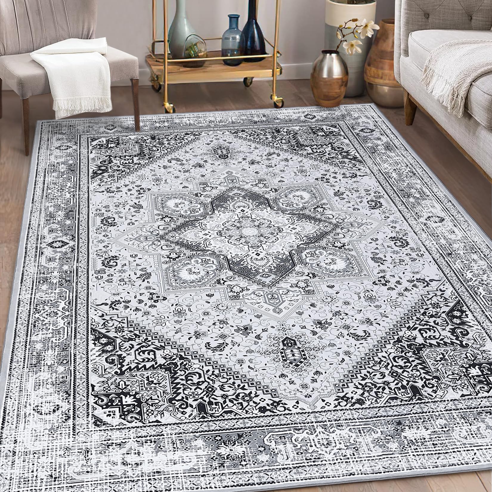 Garvee Washable Area Rug 8x10 Large Bohemian Rugs Oriental Rug Medallion Rug Non-Slip Stain-Resistant Rug, Grey Floral Pattern Vintage Rug for Living Room Bedroom Home Office,8x10
