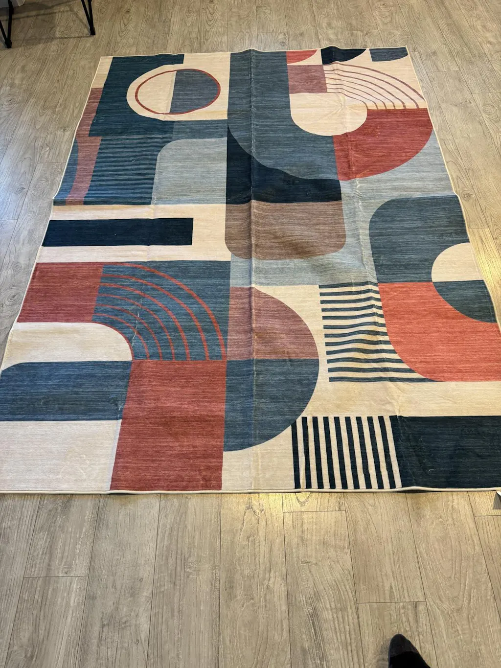 This rug looks even better in person! The colors are vibrant but balanced — the mix of blues, reds, and neutrals gives the space a modern, cozy vibe. It feels soft underfoot and lays flat right out of the package with no curling. The low pile makes it easy to vacuum and perfect for high-traffic areas. It’s also lightweight and easy to move if you want to rearrange your furniture. Overall, it’s a stylish and affordable way to add some life and color to your living room or bedroom!