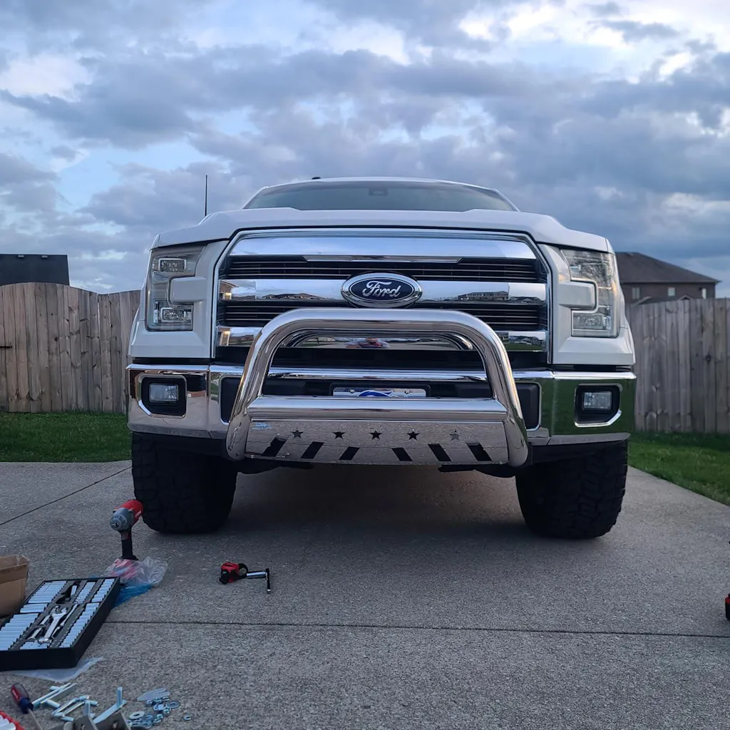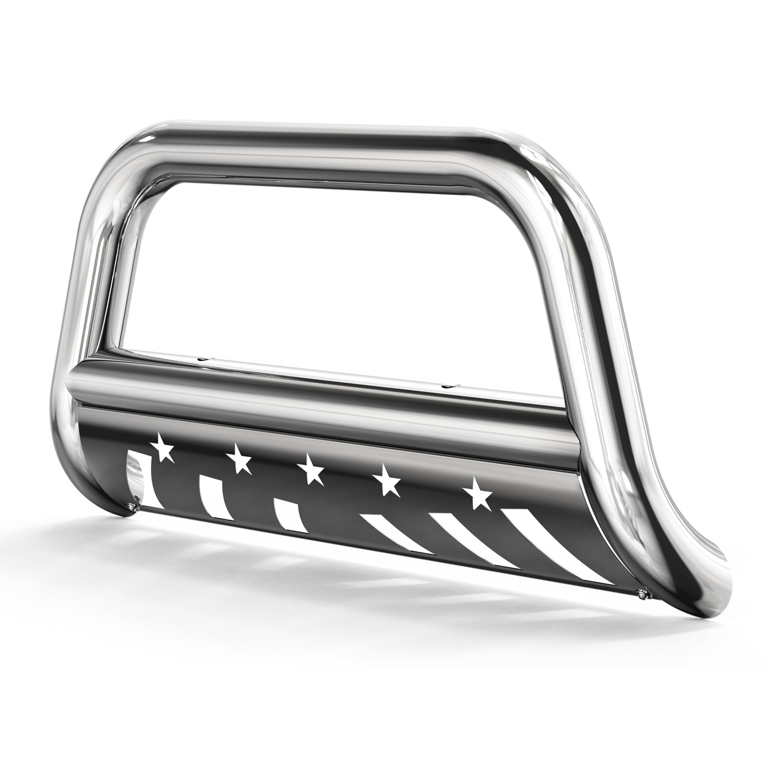 Bull Bar Front Grille Brush Push Bumper Guard with Skid PlateE-coating and black powder coating two coats and bull bars polisheded to ensure durability and rust resistance. This bull bar made of heavy-duty all-steel frame, it is very solid and durable.3" rust-resistant bull bar provides additional protection for the front of your vehicle, it can effectively prevent impact.No additional operation, 100% bolt-on installation, no drilling, all mounting hardware and Installation instruction included, the bull bar can be easily installed at home with common garage tools.