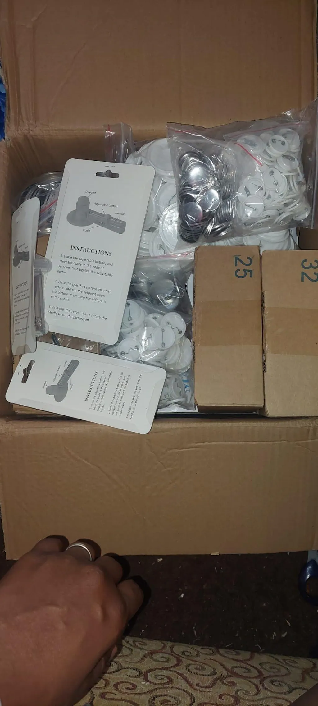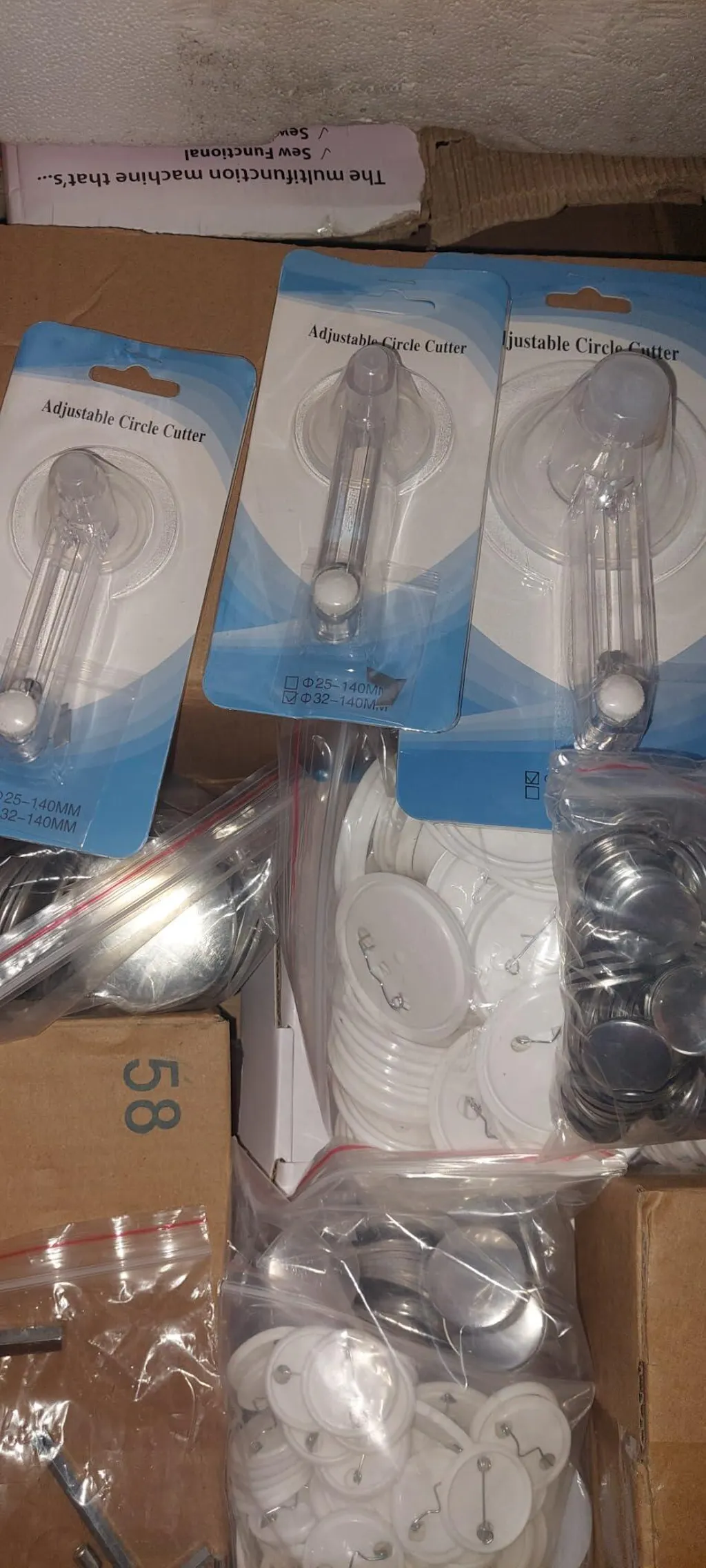 - All-Inclusive Accessory Set Everything you need for badge-making in one package! Includes 100 each of 0.98/1.25/2.28 inch (25/32/58mm) iron and plastic bottom badges, 100 tin up covers for each size, 20 blank circle papers per size, 100 transparent films per size, 1 circle cutter for each size, toolkit and detailed user manual.