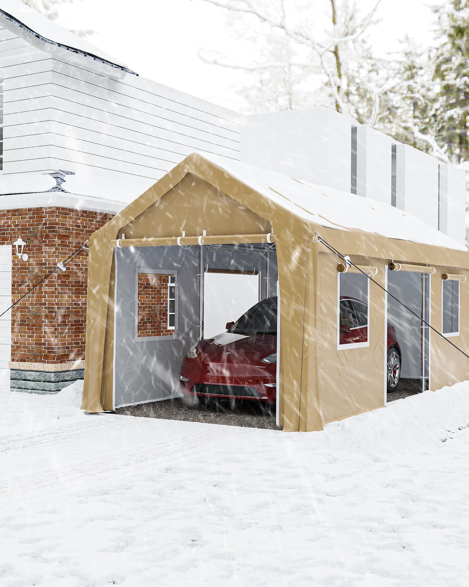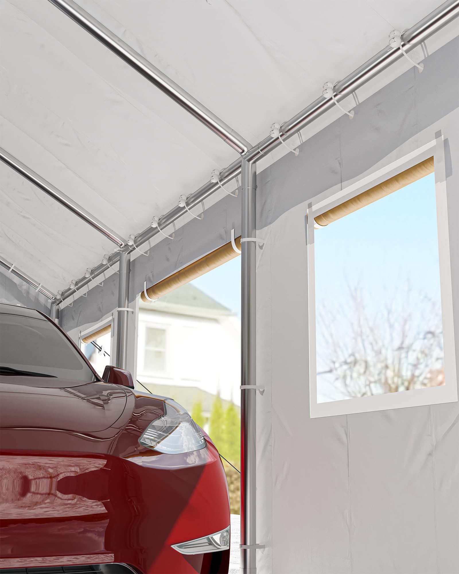 - HEAVY DUTY CARPORT CONSTRUCTION - Thick galvanized steel frame, sturdy, stable, and not easy to rust. Thick PE top cover and sidewall, tough, waterproof, and UV resistant.