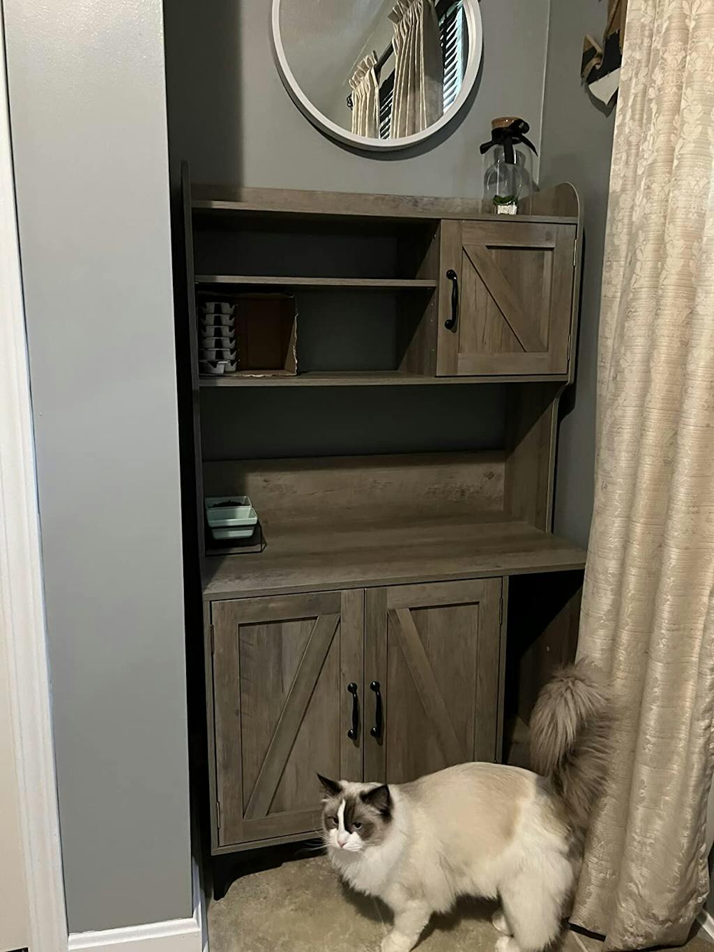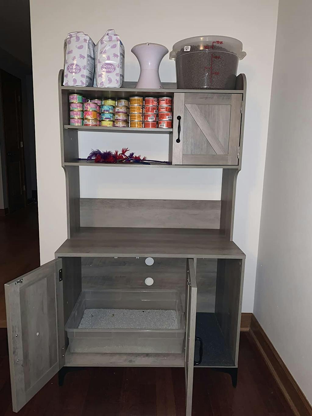Large interior compartment (22.4"L x 17.7"W x 19.6"H) perfect for litter box placement. Multiple storage layers provide ample space for pet supplies, toys, and household items.