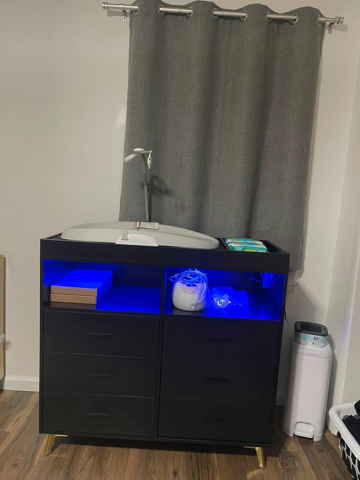 Garvee Changing Table Dresser with Drawers, Baby Dresser with Changing Table Top, Power Outlet, LED Light & Metal Feet, Diaper Changing Station Nursery Organizer for Infants Newborn, Black