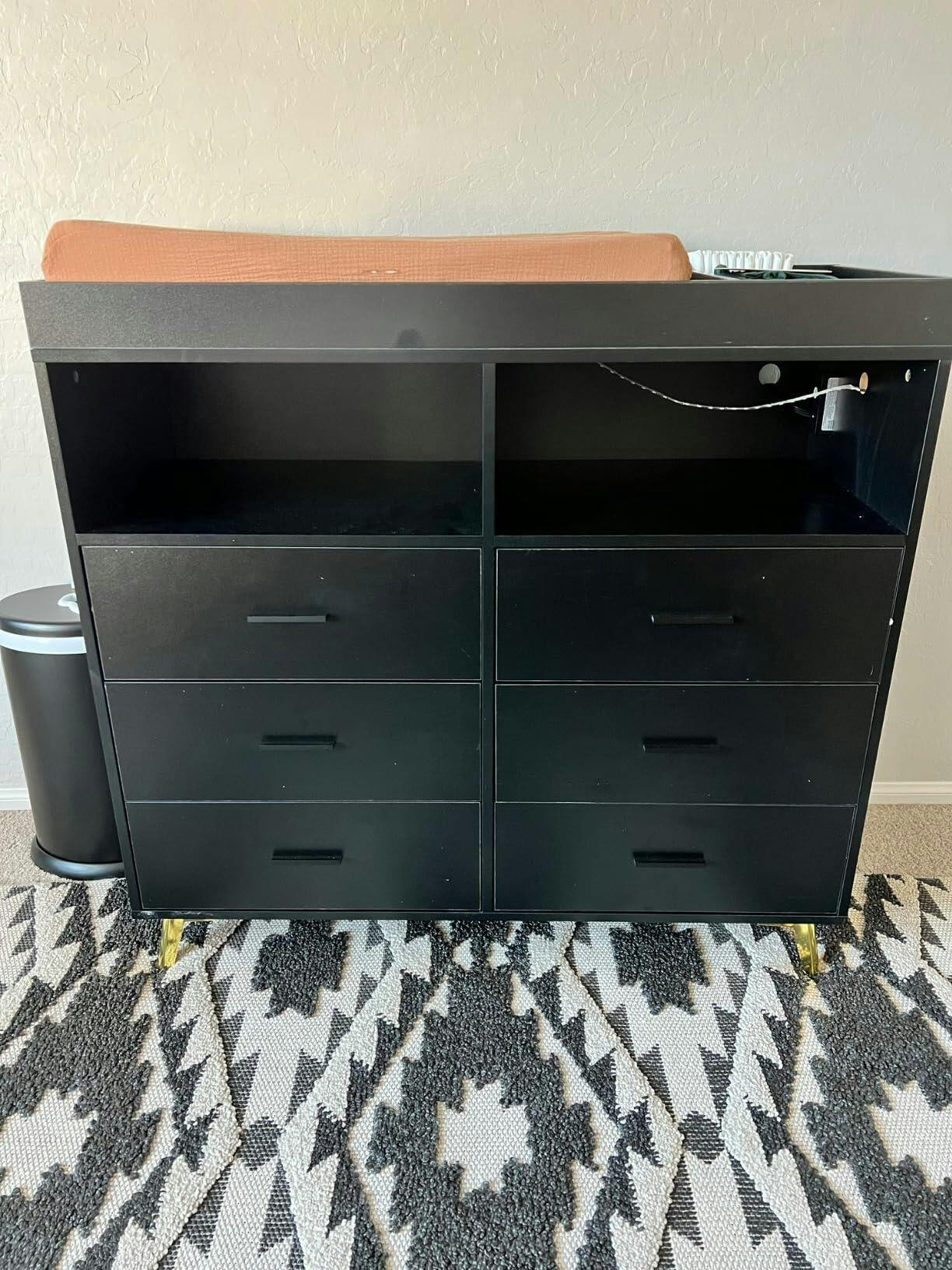 - Baby Changing Table with Changing Pad: Parents can change the little one's clothes and diapers conveniently on the changing table top. The height of 41.34 inches can reduce the stress caused by bending over when parents are changing diapers and dressing the child. 6 drawers and 2 open storage shelves provide enough space to store all kinds of baby products and keep them clean and tidy.