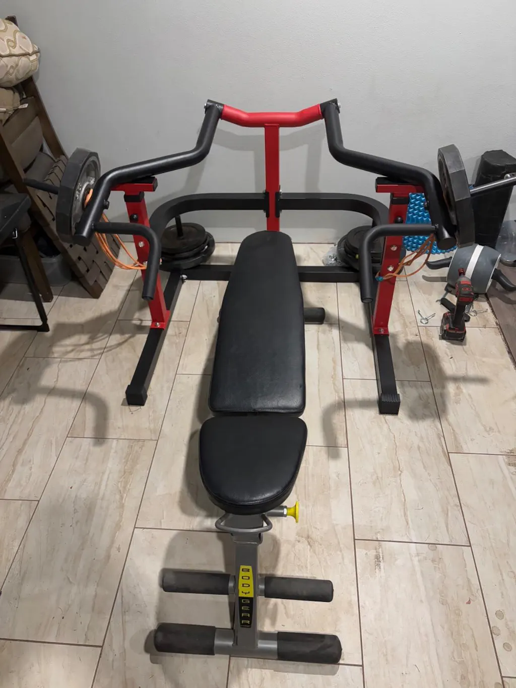 GARVEE Chest Press Machine - 1050LBS Capacity Weight Bench with Adjustable Flat Bench and Independent Converging Arms for Upper Body Workouts (Red)